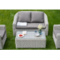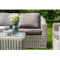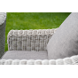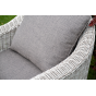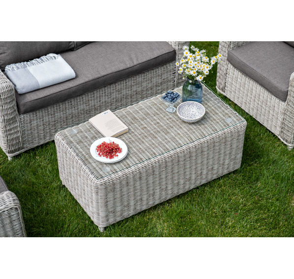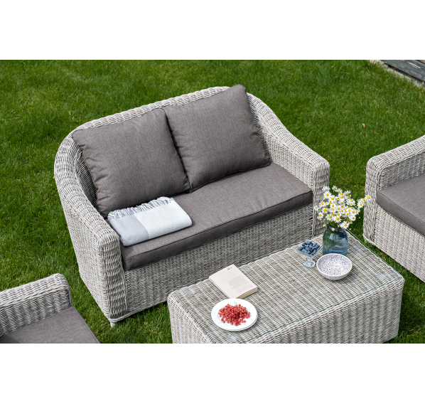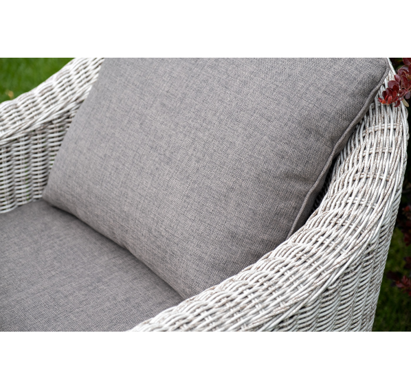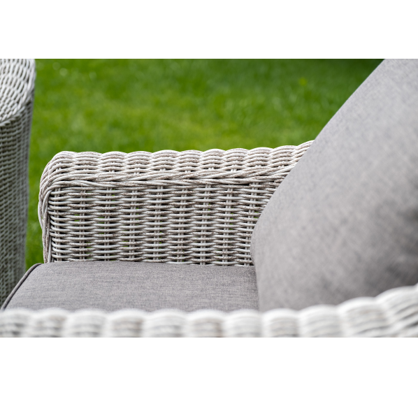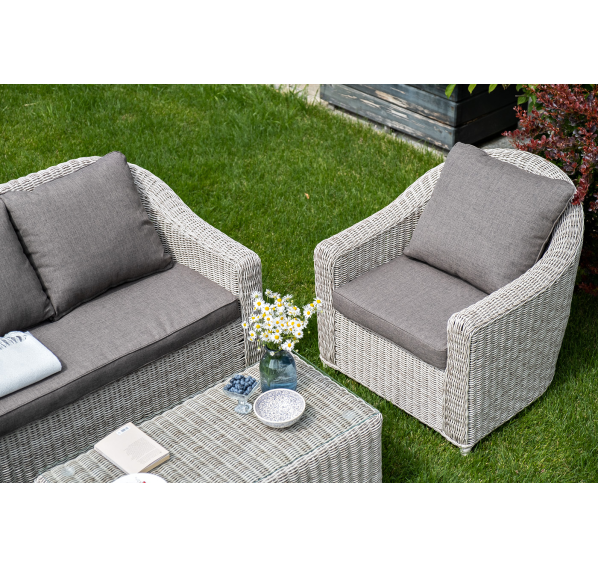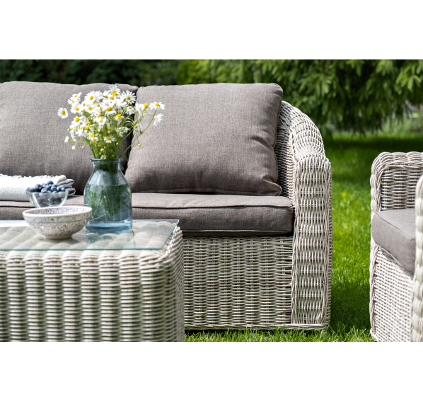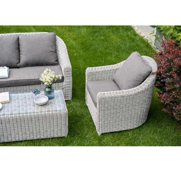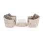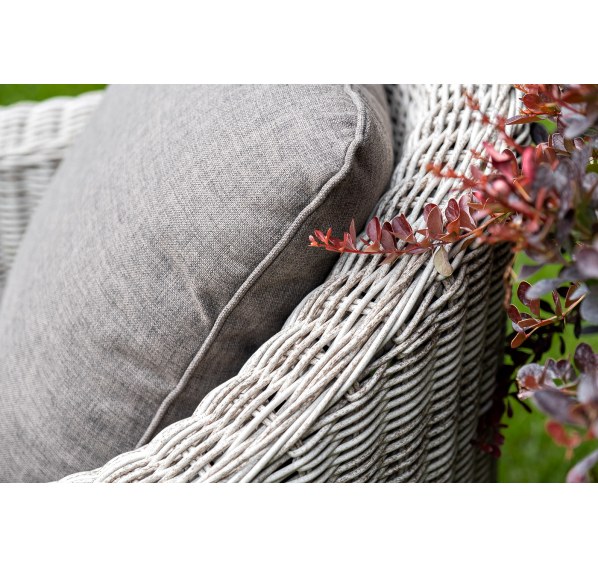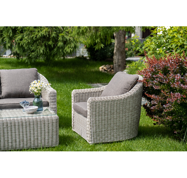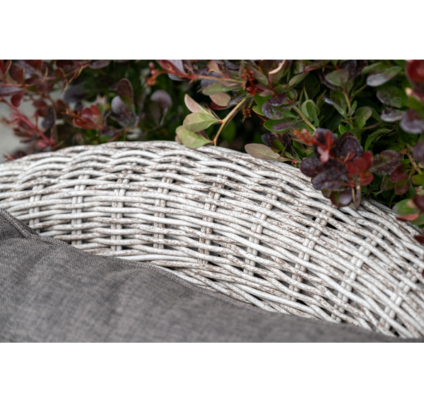 Садовая мебель выполнена из алюминиевого каркаса, выдерживающего большие нагрузки, и круглого искусственного ротанга. Каркас оплетен с помощью ручного метода и представлен в бежевом цвете.