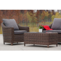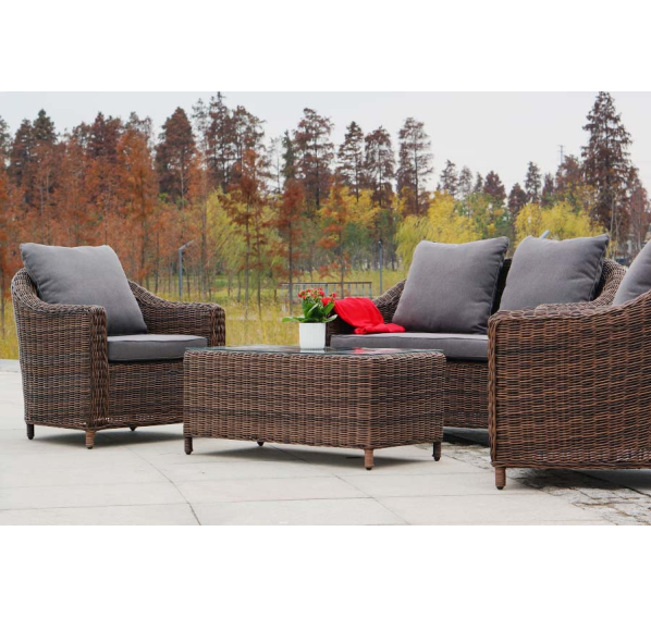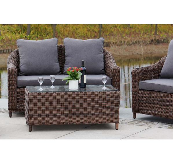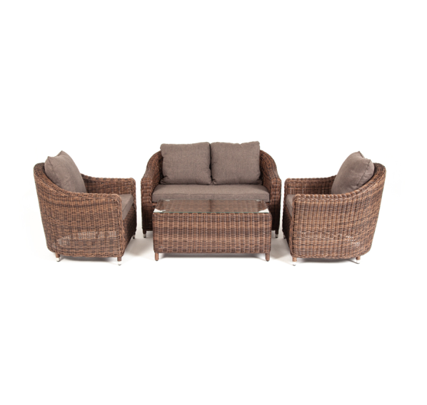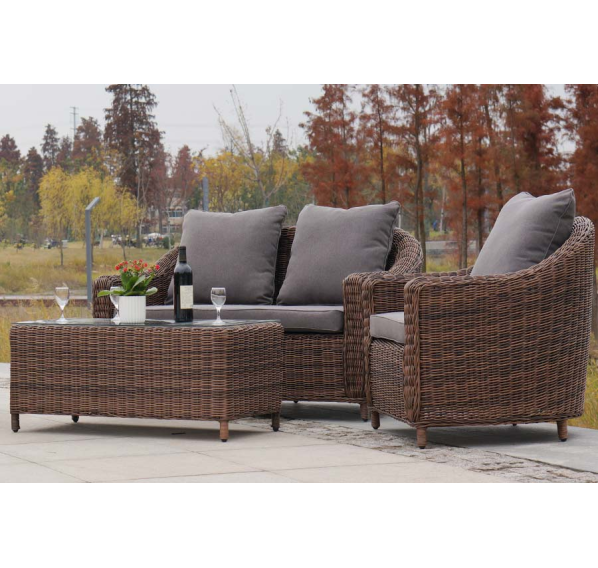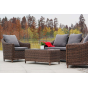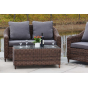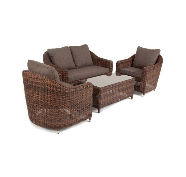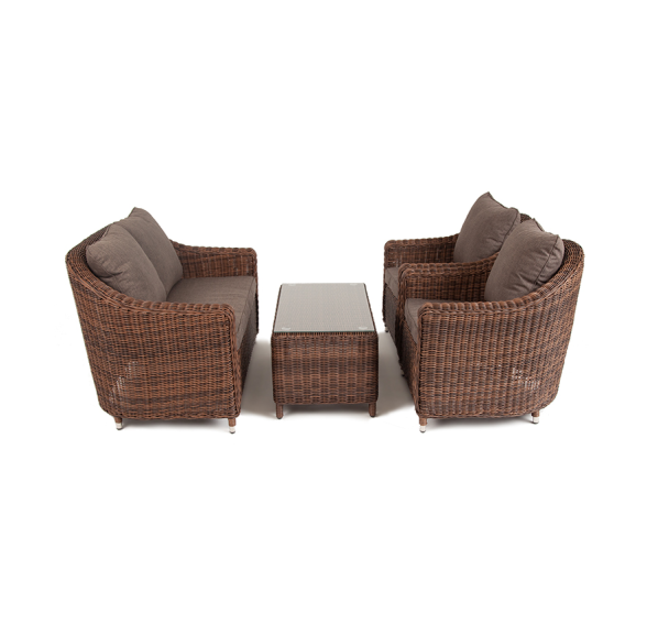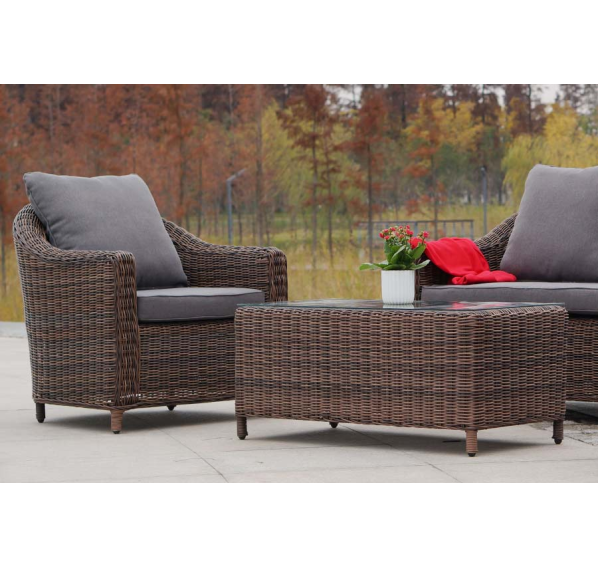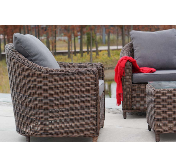 Садовая мебель выполнена из алюминиевого каркаса, выдерживающего большие нагрузки, и круглого искусственного ротанга. Каркас оплетен с помощью ручного метода и представлен в коричневом цвете.