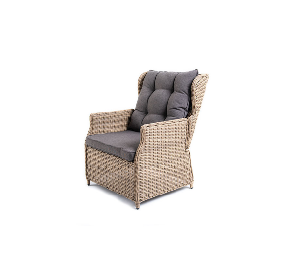 Алюминиевый каркас, круглый искусственный ротанг соломенного цвета, ручное плетение. Кресла оснащены подушками со съёмными чехлами.