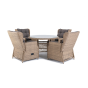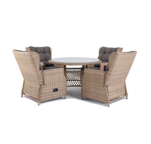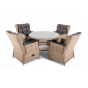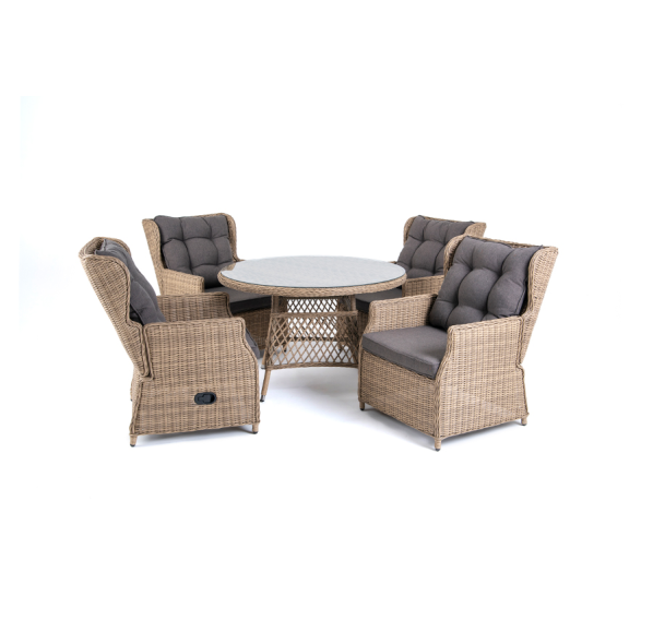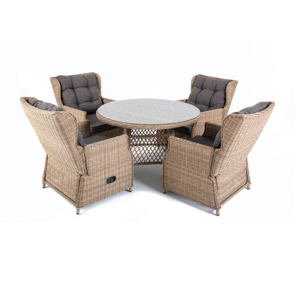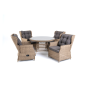 Обеденная группа из искусственного ротанга: 4 раскладывающихся кресла и обеденный стол со стеклянной столешницей.