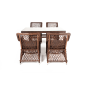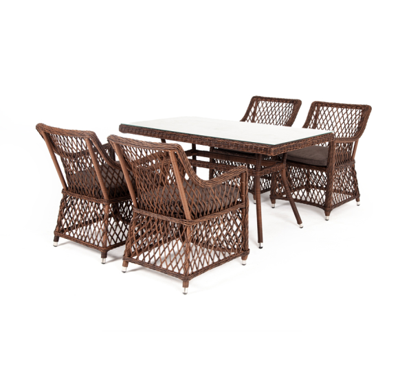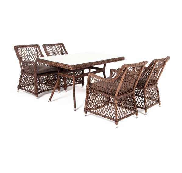 Комплект гармонично сочетает в себе алюминий, из которого выполнен каркас и декор из искусственного ротанга насыщенного шоколадного оттенка. Прекрасным дополнением мебели стали мягкие подушки из всепогодной ткани со съёмными чехлами.