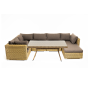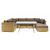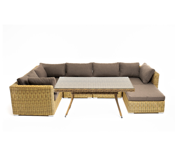 Облегченный алюминиевый каркас, вручную оплетенный долговечным искусственным ротангом натурального соломенного оттенка. Обеденный стол с прочной стеклянной столешницей толщиной 5 мм.