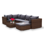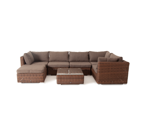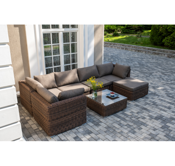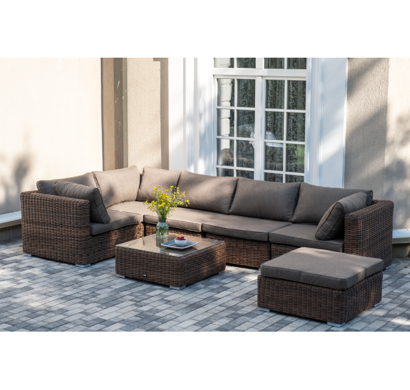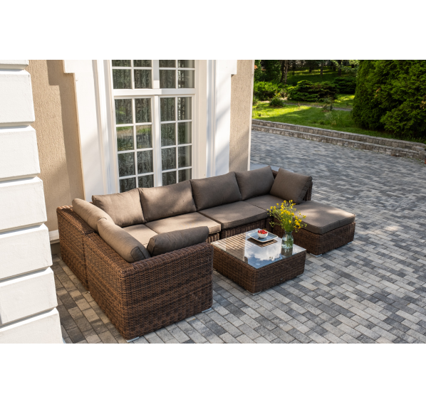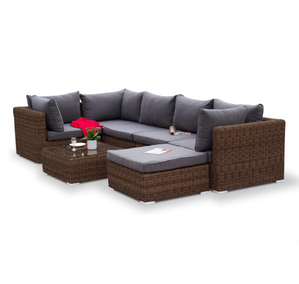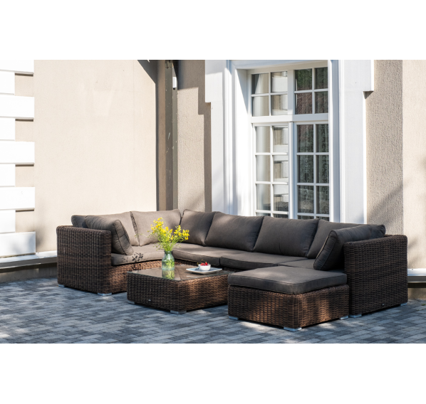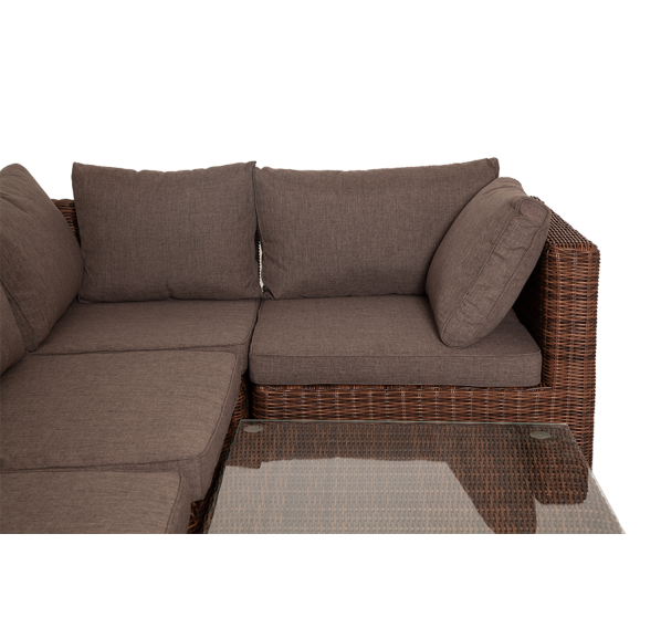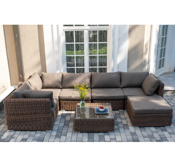 При изготовлении каркаса всех составляющих комплекта используется высокопрочный алюминий. Он дополнен круглым плетением из искусственного ротанга. Цвет – коричневый.