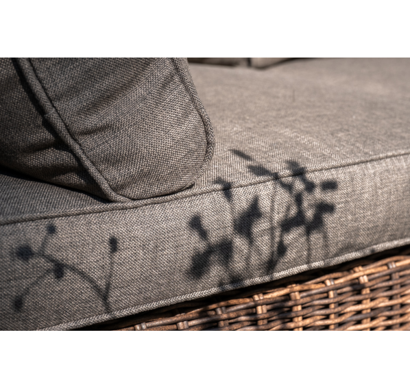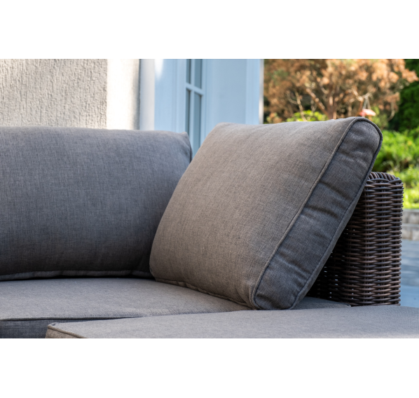Модули дивана и оттоманка укомплектованы подушками со съёмными чехлами серого цвета. Они состоят из полиэстера с плотностью 300гр/м2. Защитные качества материала усилены путем его обработки влагоотталкивающими составами.