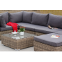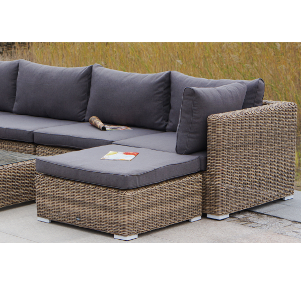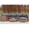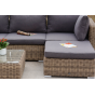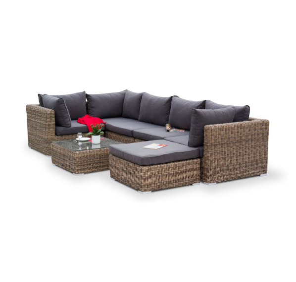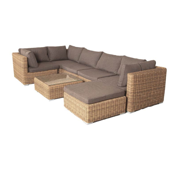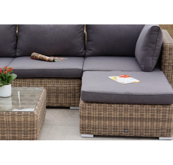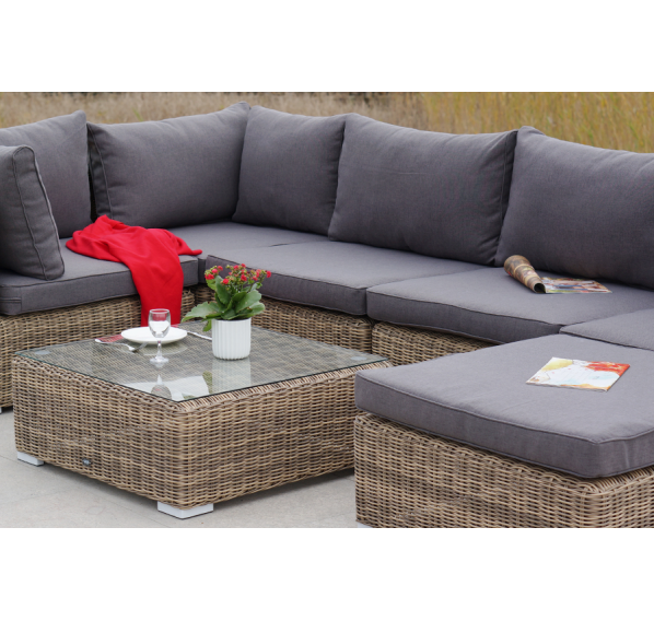 Облегченный алюминиевый каркас, вручную оплетенный долговечным искусственным ротангом натурального соломенного оттенка. Журнальный столик с прочной стеклянной столешницей толщиной 5 мм.