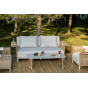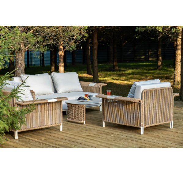 Комплект выполнен из алюминиевого каркаса, окрашенного порошковой износостойкой краской. Оттенок - «слоновая кость». Искусственный ротанг соломенного цвета украшает мебель в качестве круглого ручного плетения - 7 мм.