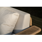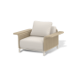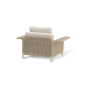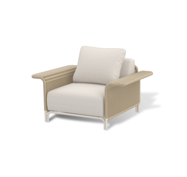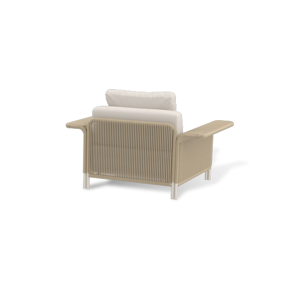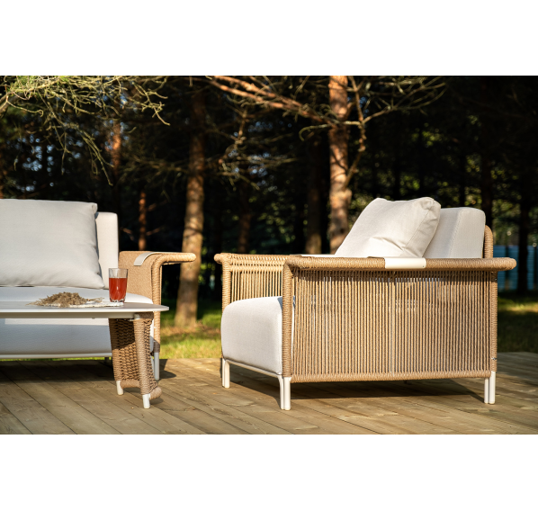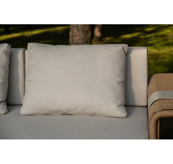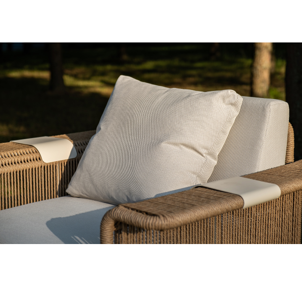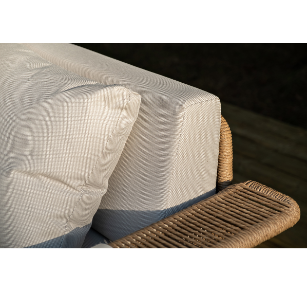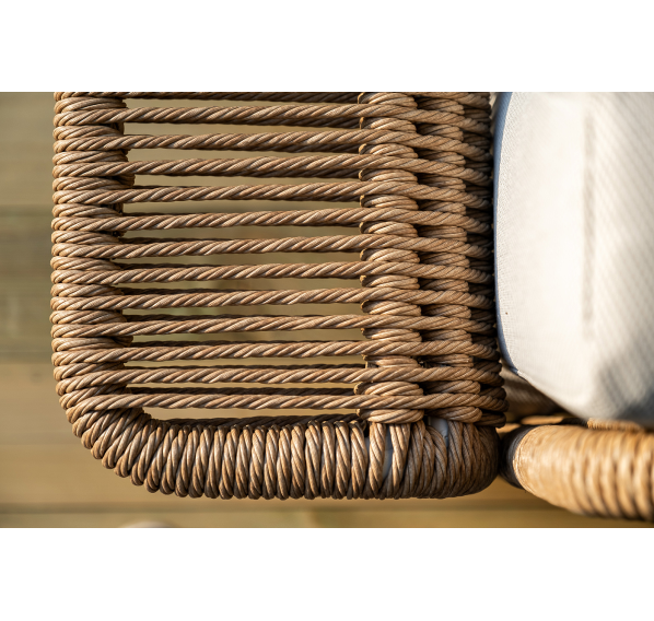 Укомплектовано плетеное кресло удобными мягкими подушками, одна из которых располагается в области спинки. Они выполнены в бежевом оттенке. При пошиве тканевых изделий используется 100% полиэстер, плотностью 300гр/м2. Он в обязательном порядке проходит обработку влагоотталкивающей пропиткой.