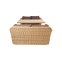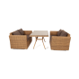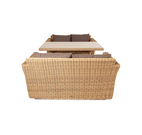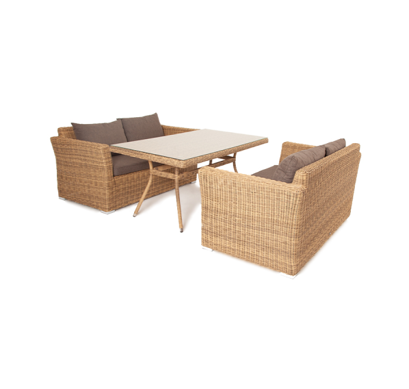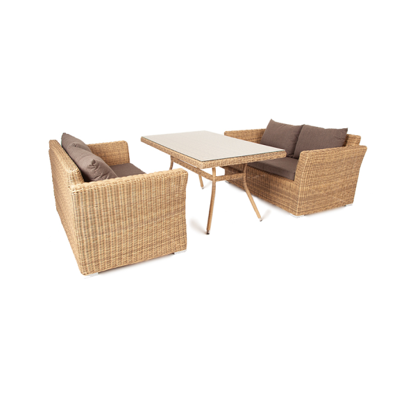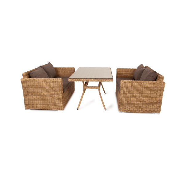 Конструкция мебели изготовлена из алюминия, вручную оплетенного синтетической лозой, имитирующей натуральный ротанг. На сидениях и спинках диванов предусмотрены подушки из полиэфирной ткани с влагоотталкивающей пропиткой и съёмными чехлами. Мебель представлена в натуральном соломенном оттенке.