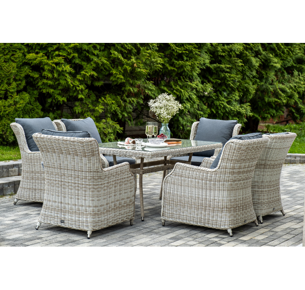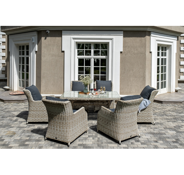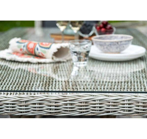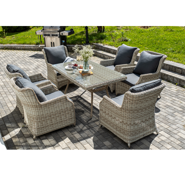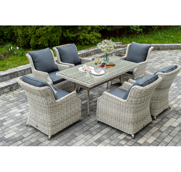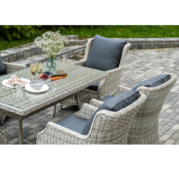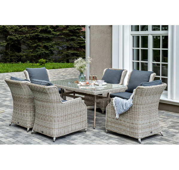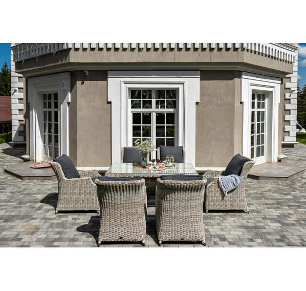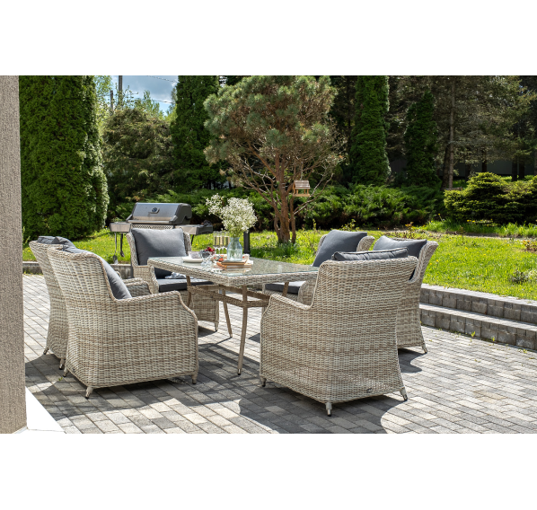 Столешница укомплектована ударопрочным стеклом, толщиной 5 мм. Данное стекло крепится к столу при помощи четырех вакуумных силиконовых присосок и поставляется в собранном виде. Плетеные стулья для удобства использования оснащены подлокотниками и подушками серого цвета на спинках и сидениях. Ткань обработана влагоотталкивающей пропиткой.