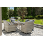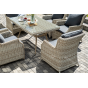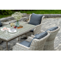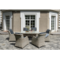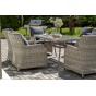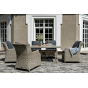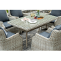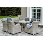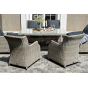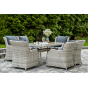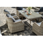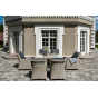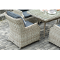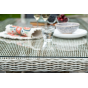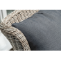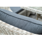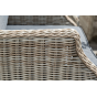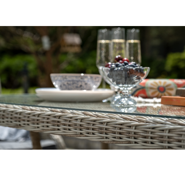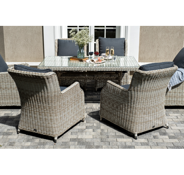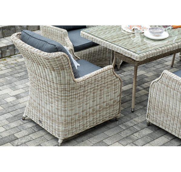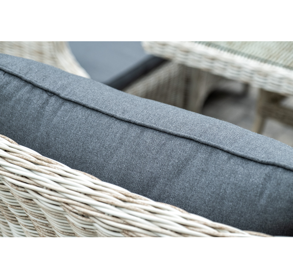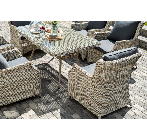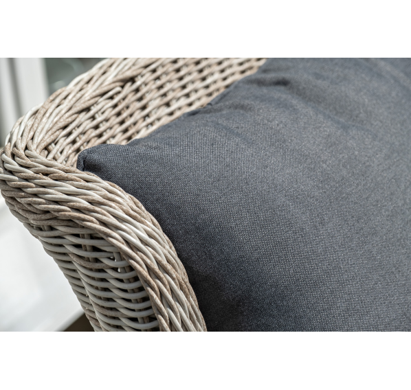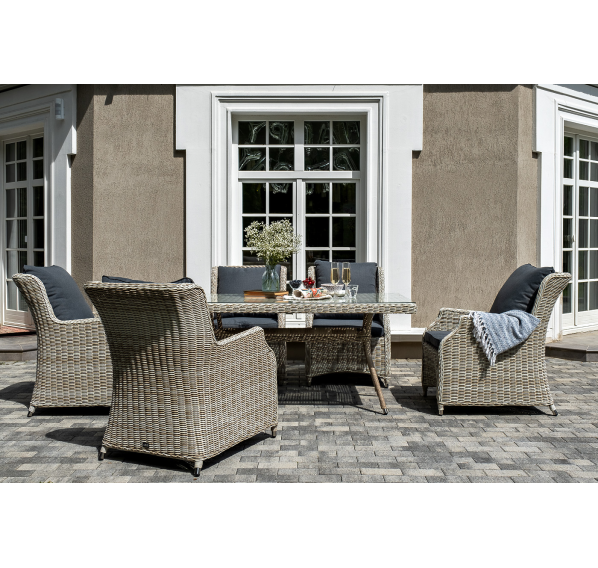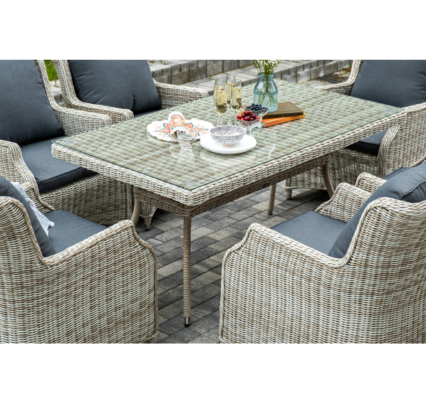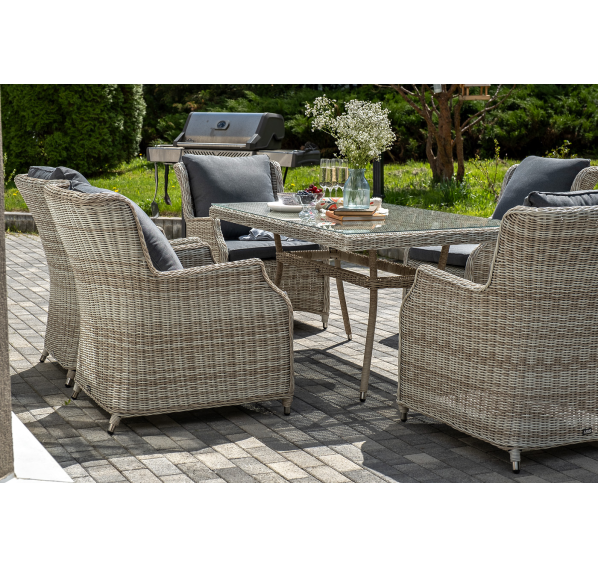 Столешница укомплектована ударопрочным стеклом, толщиной 5 мм. Данное стекло крепится к столу при помощи четырех вакуумных силиконовых присосок и поставляется в собранном виде. Плетеные стулья для удобства использования оснащены подлокотниками и подушками серого цвета на спинках и сидениях. Ткань обработана влагоотталкивающей пропиткой.