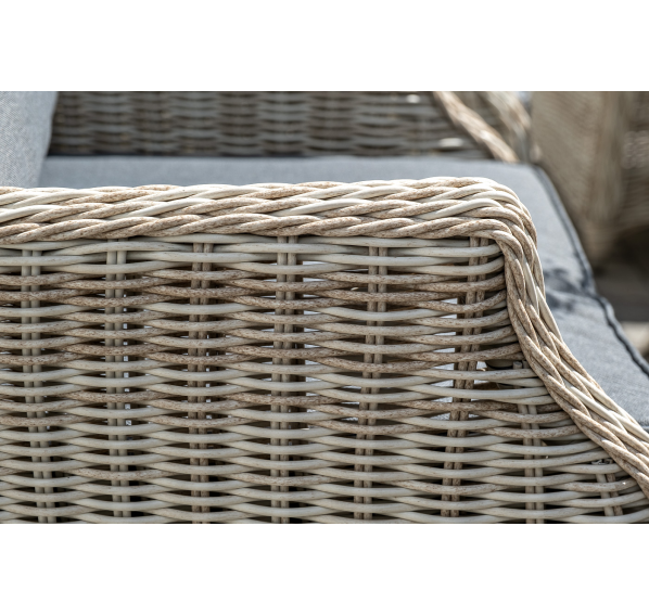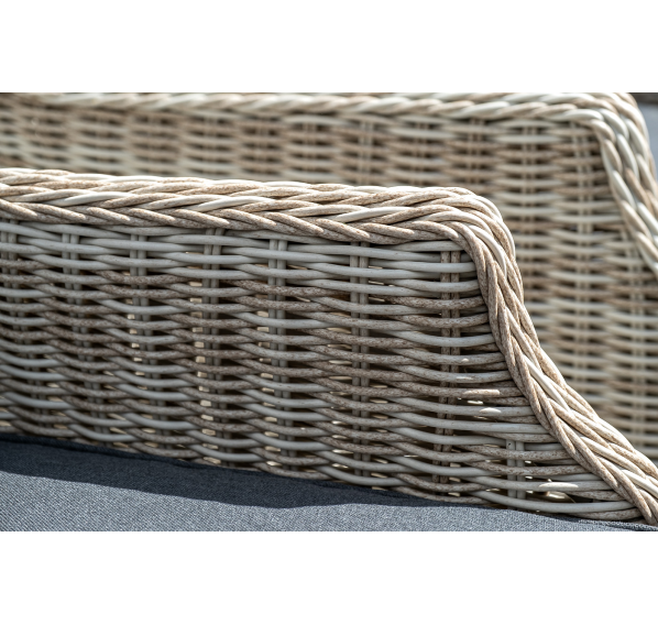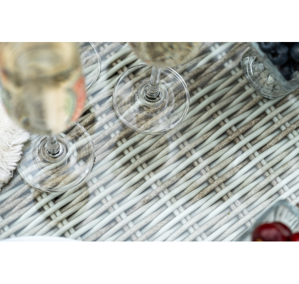 Каркас всех изделий выполнен из легкого и долговечного алюминия, оплетенного вручную круглым искусственным ротангом натурального бежевом цвета.