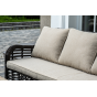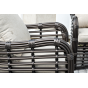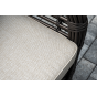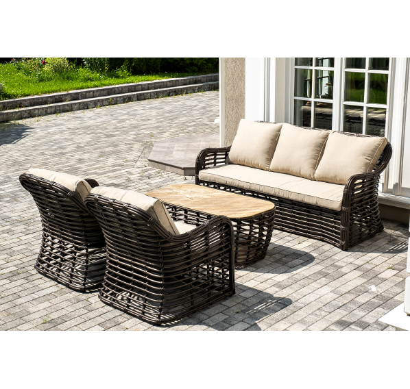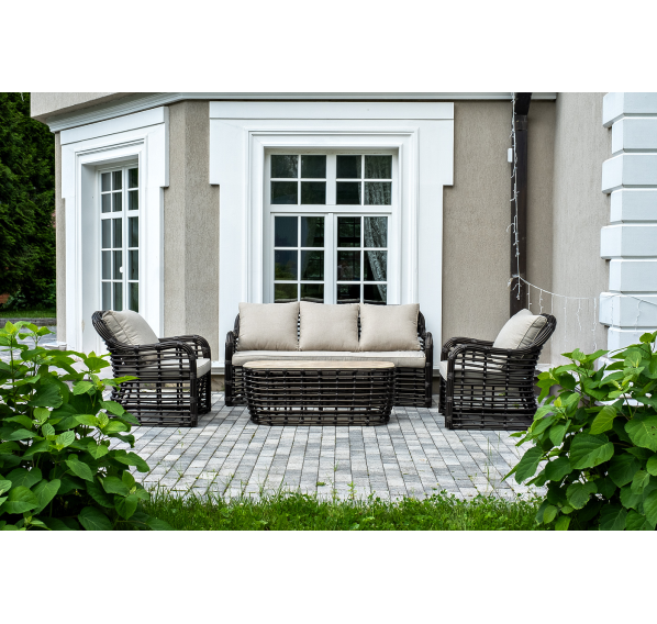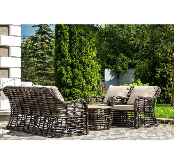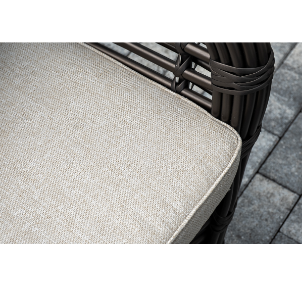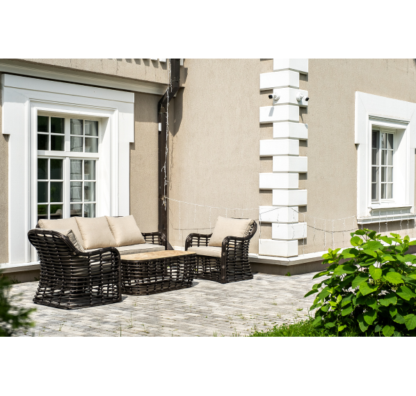 Плетеная мебель дополнена удобными подушками в бежевых чехлах. При их изготовлении используют полиэстер, плотность – 300гр/м2. Он обрабатывается влагоотталкивающей пропиткой для повышения защитных свойств материала.