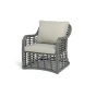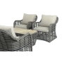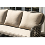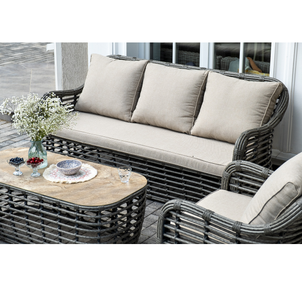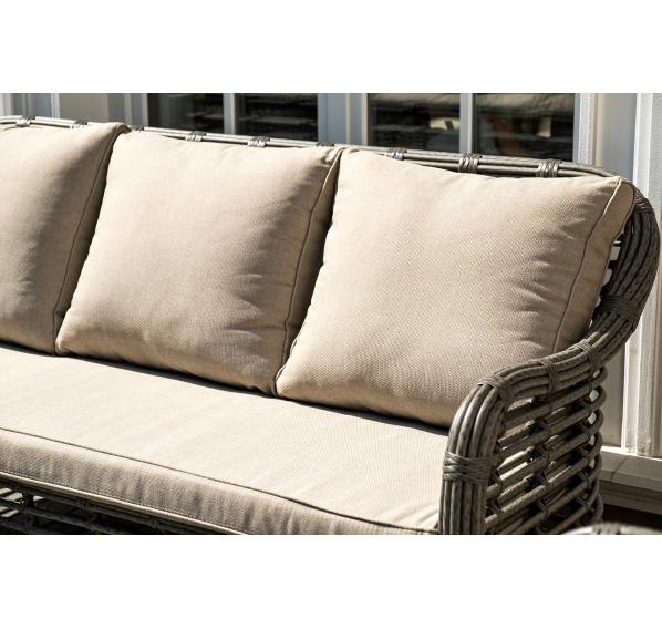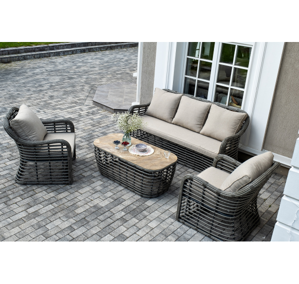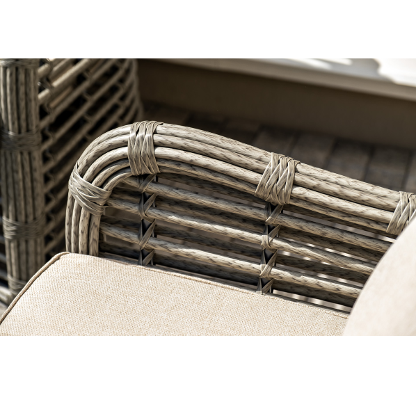 Плетеная мебель дополнена удобными подушками в бежевых чехлах. При их изготовлении используют полиэстер, плотность – 300гр/м2. Он обрабатывается влагоотталкивающей пропиткой для повышения защитных свойств материала.