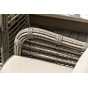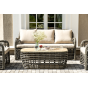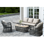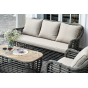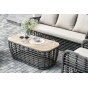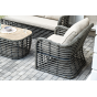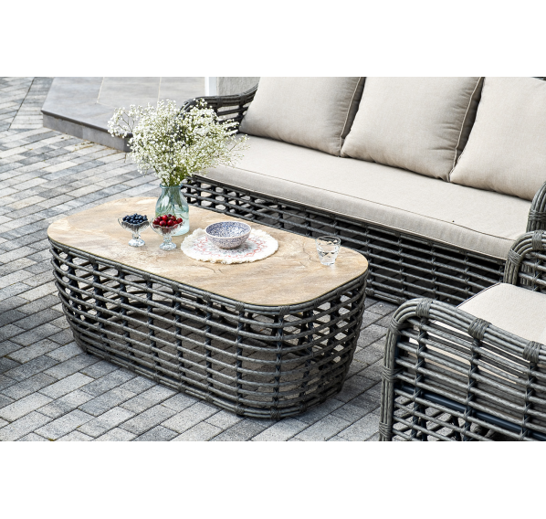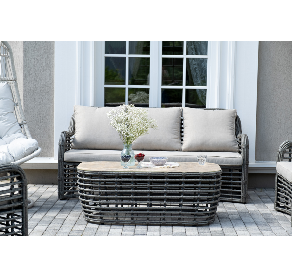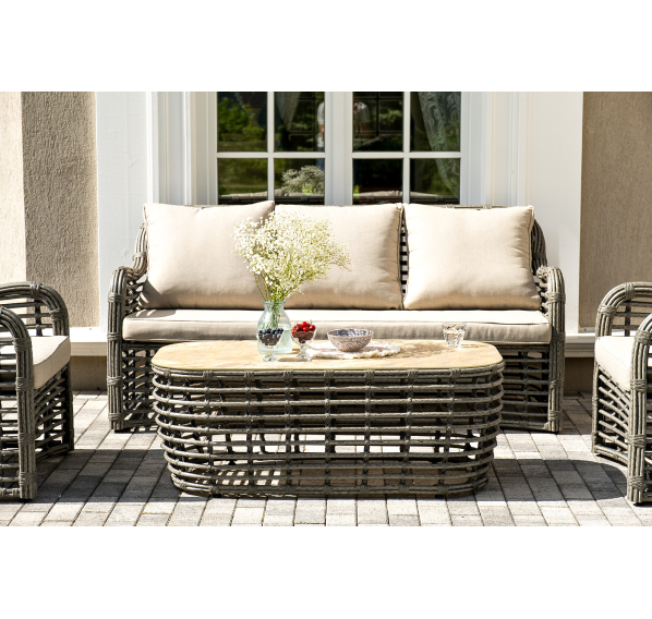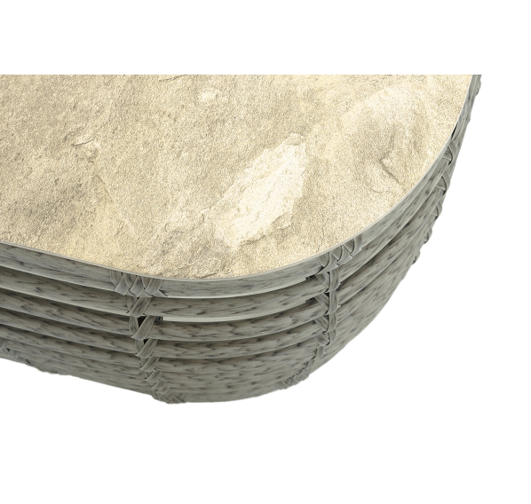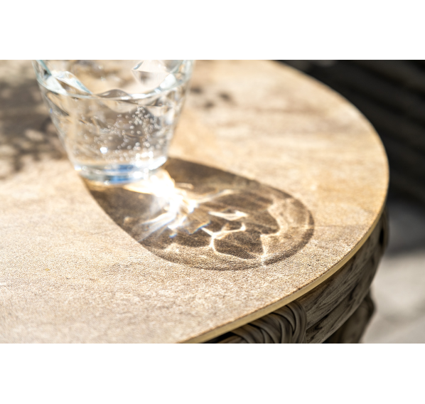 Журнальный столик выполнен из алюминия, вручную оплетенного круглым искусственным ротангом. Столешница из закаленного стекла толщиной 5 мм. Благодаря износостойким материалам, стол пригоден для использования на улице при любой погоде и не требует специальных условий хранения.