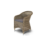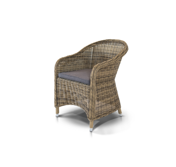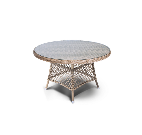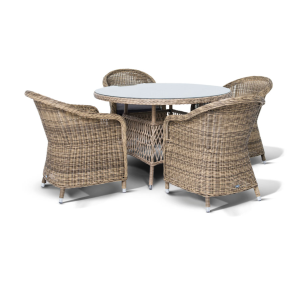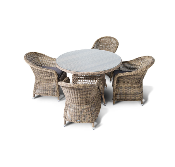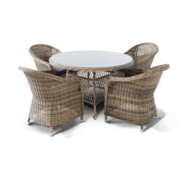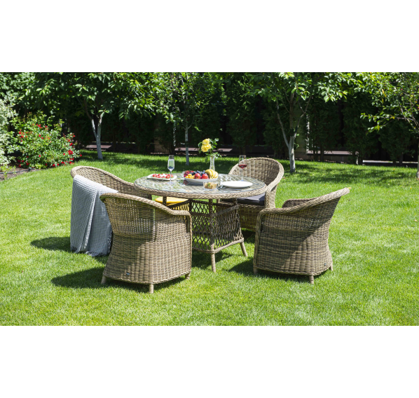 Обеденная группа «Равенна» на 4 персоны из круглого искусственного ротанга. Стулья с подлокотниками в комплекте с подушками серого цвета. Круглый стол со стеклянной столешницей из каленного стекла толщиной 5 мм. Ручное плетение. Алюминиевый каркас. Подушки из водостойкой полиэфирной ткани.