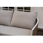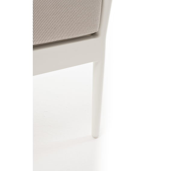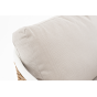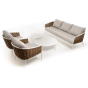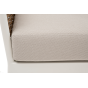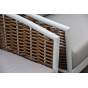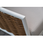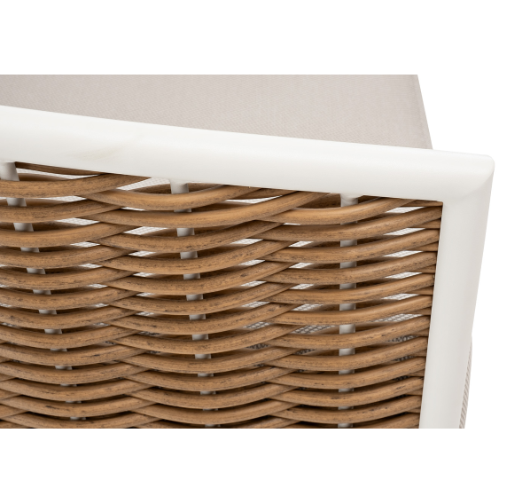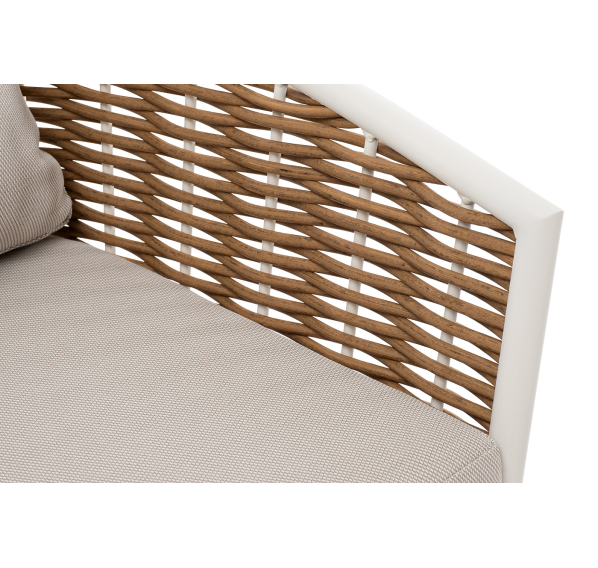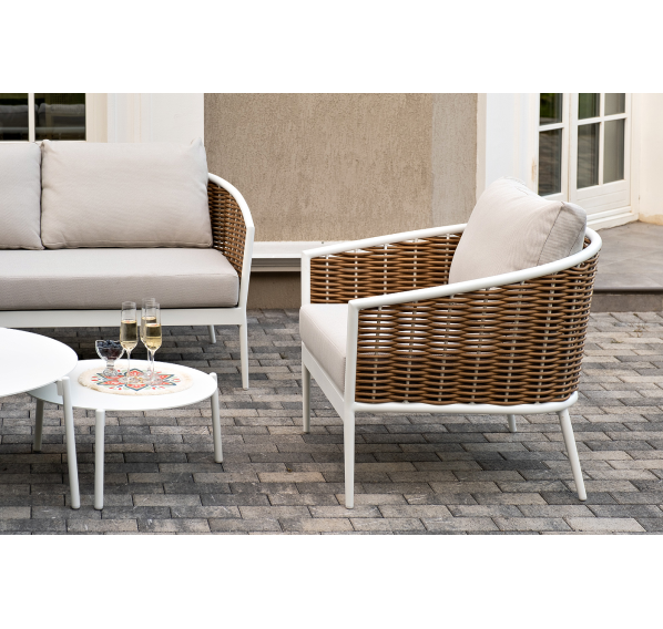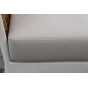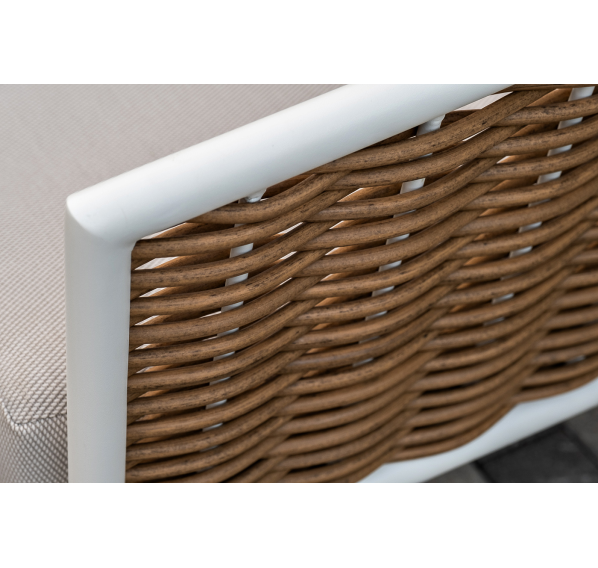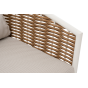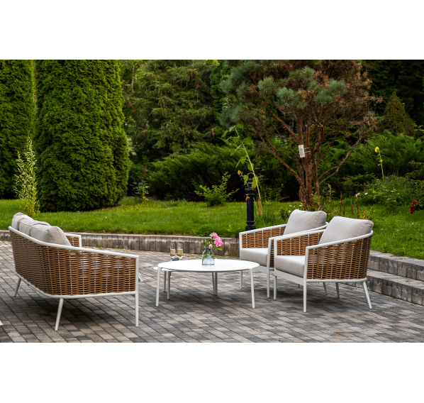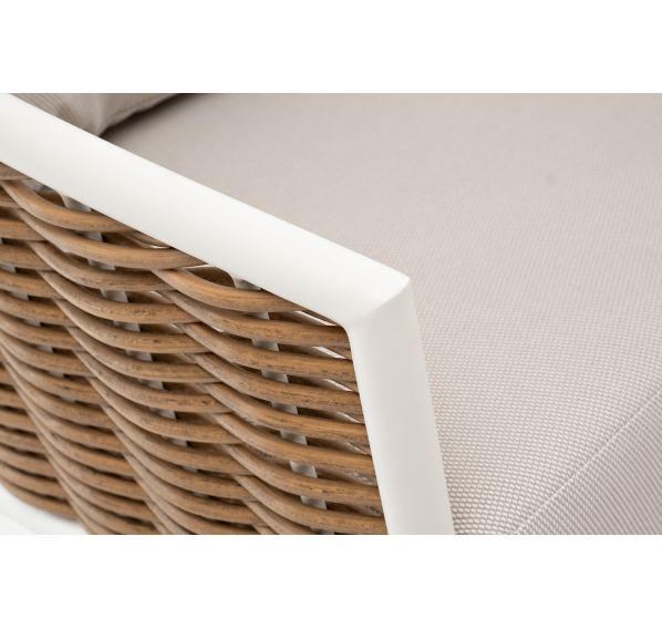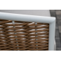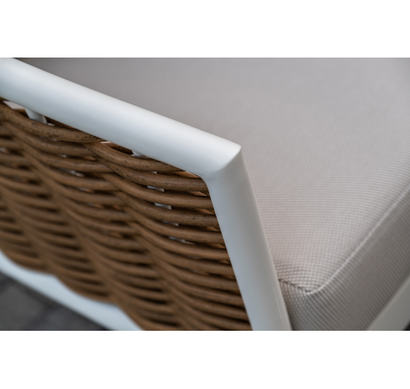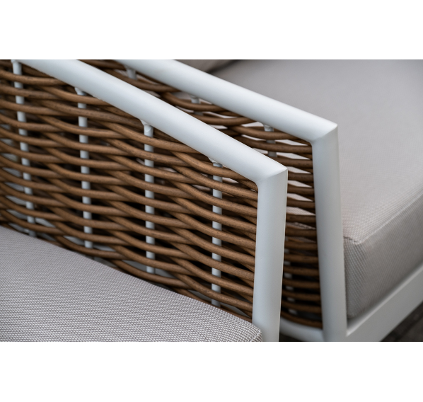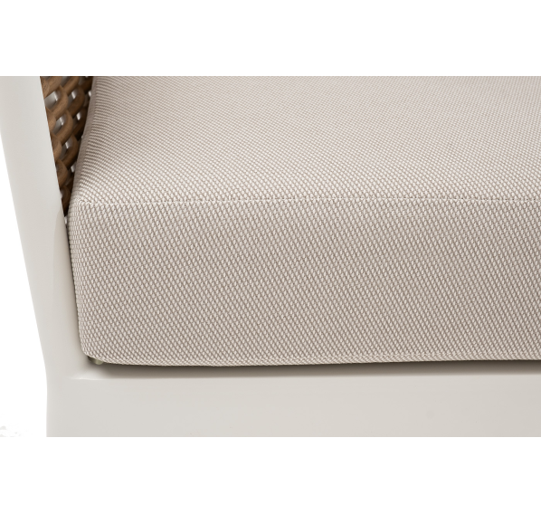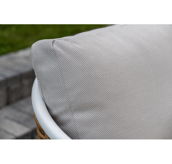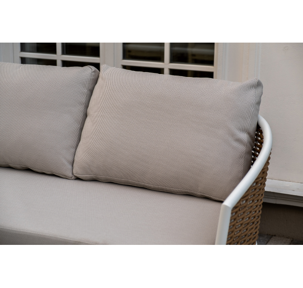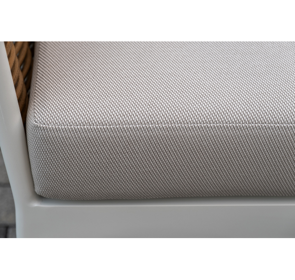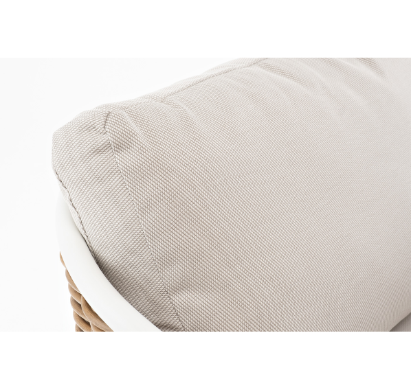 Плетеная мебель дополнена удобными подушками в бежевых чехлах. При их изготовлении используют полиэстер, плотность – 300гр/м2. Он обрабатывается влагоотталкивающей пропиткой для повышения защитных свойств материала.