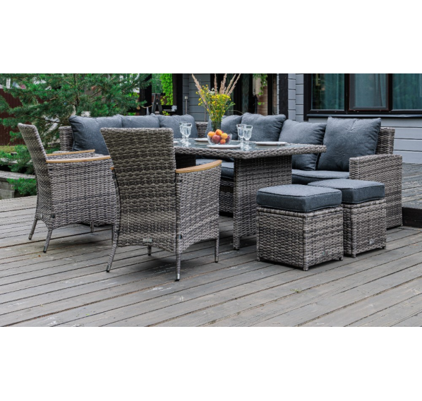 - 3 места — Стол:152х11х91,5 см Диван, пуфы:178х68х86 см Кресло: 85х64х112