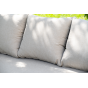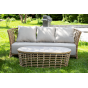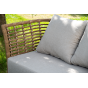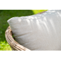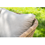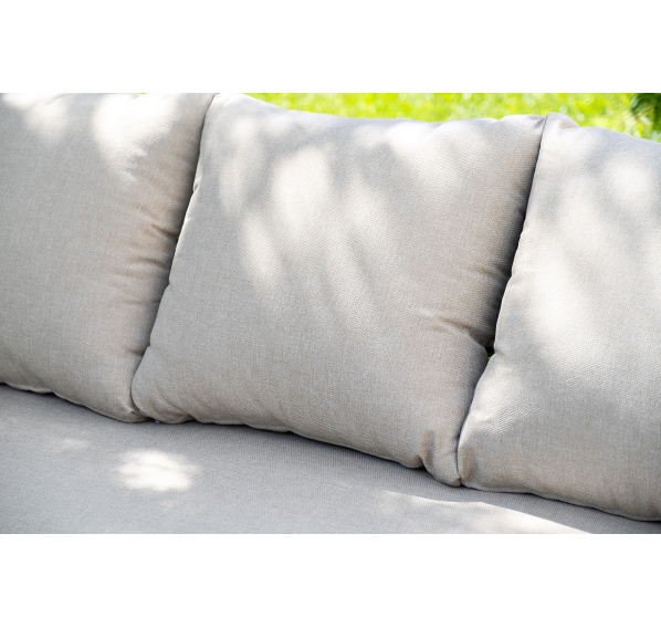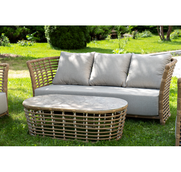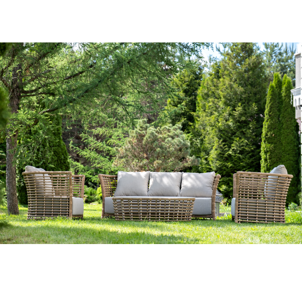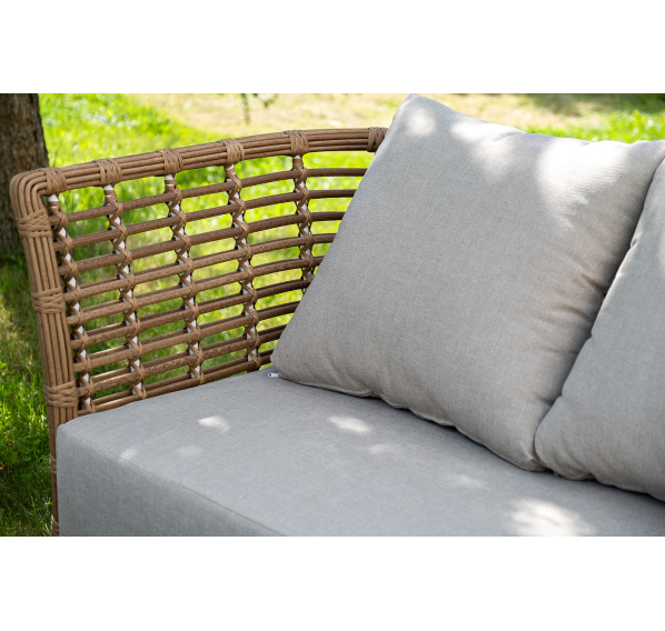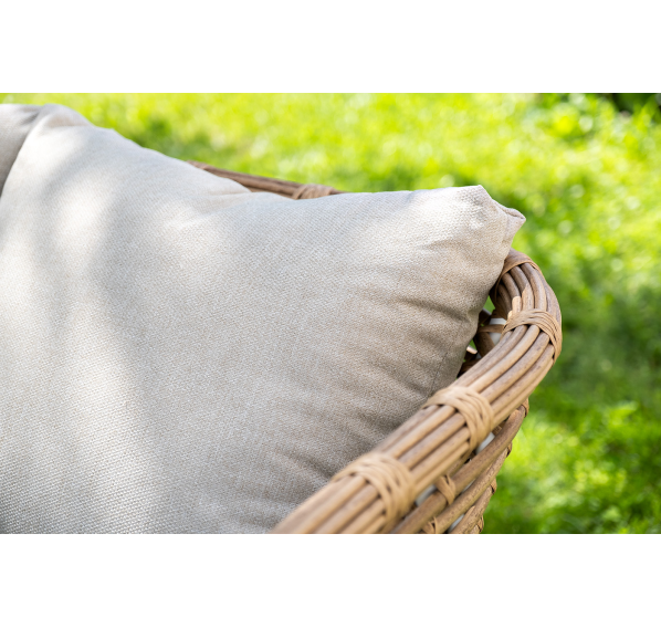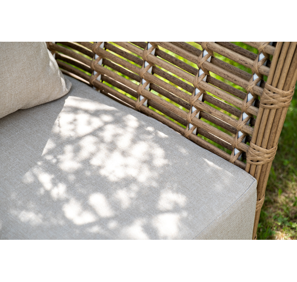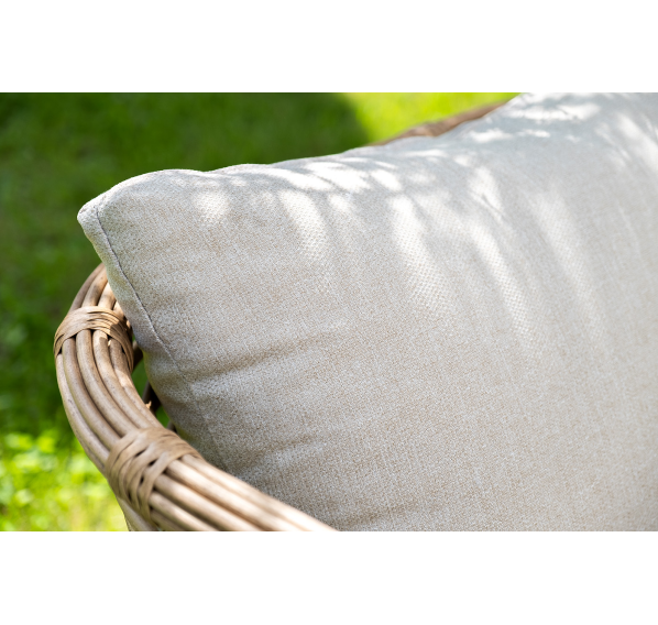 Плетеная мебель дополнена удобными подушками в бежевых чехлах. При их изготовлении используют полиэстер, плотность – 300гр/м2. Он обрабатывается влагоотталкивающей пропиткой для повышения защитных свойств материала.