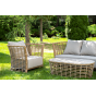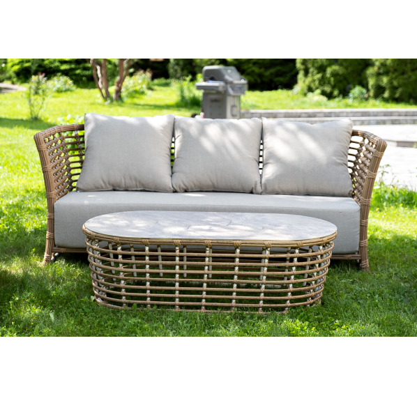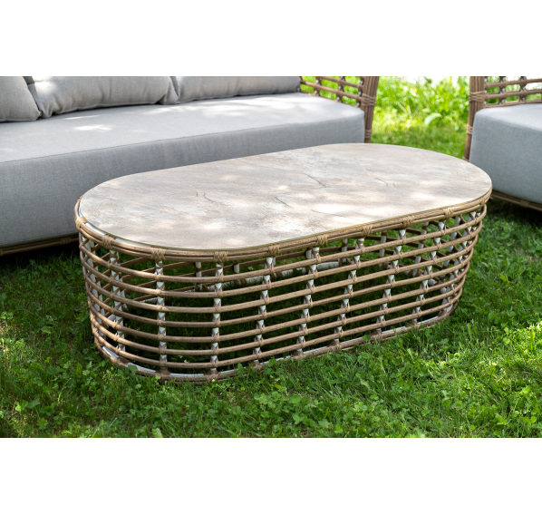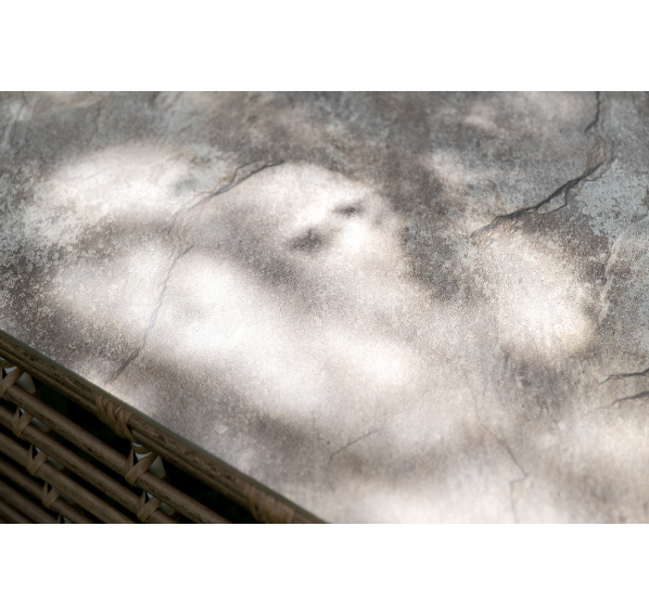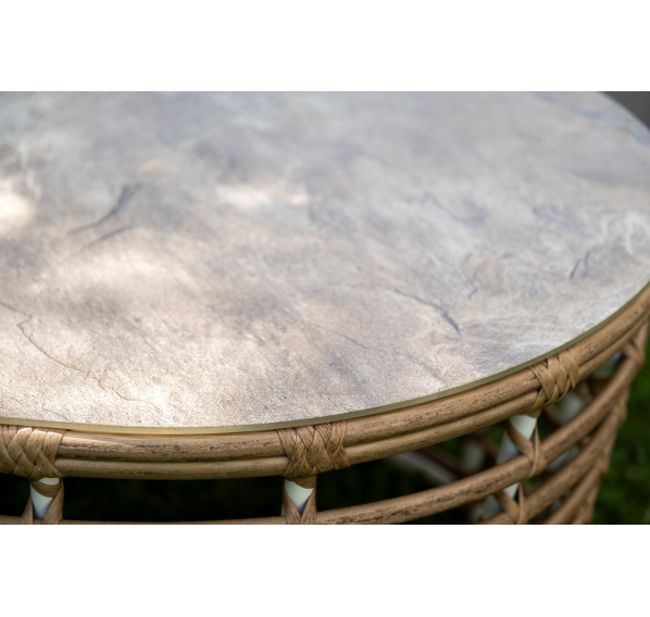 Журнальный столик выполнен из алюминия, вручную оплетенного круглым искусственным ротангом. Столешница из закаленного стекла толщиной 5 мм. Благодаря износостойким материалам, стол пригоден для использования на улице при любой погоде и не требует специальных условий хранения.