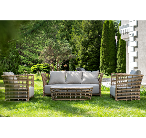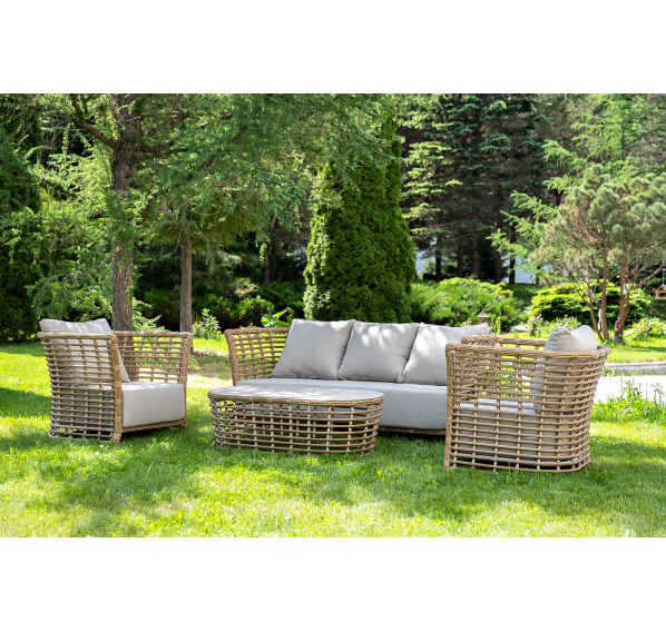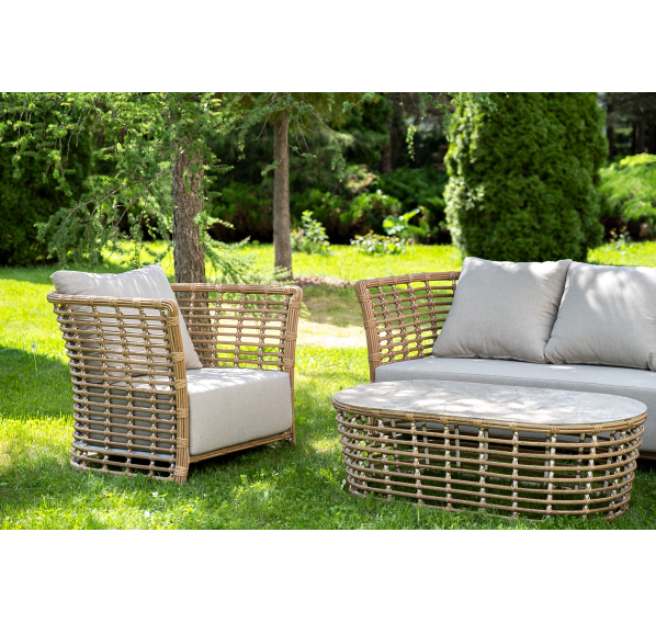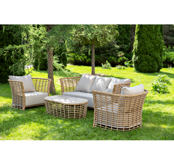 Модели имеют алюминиевый каркас, который оплетен вручную искусственным ротангом соломенного цвета.
