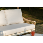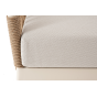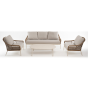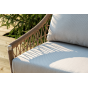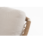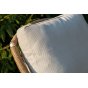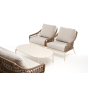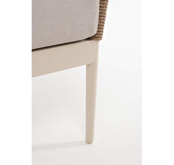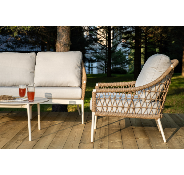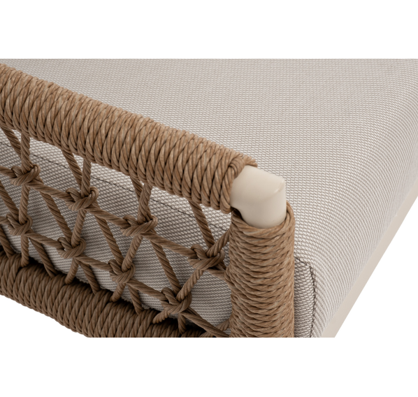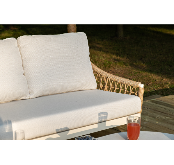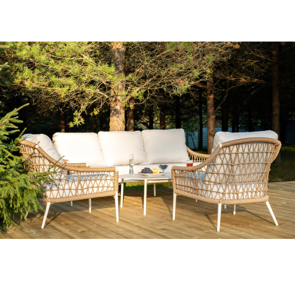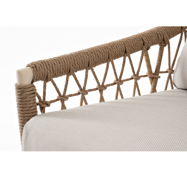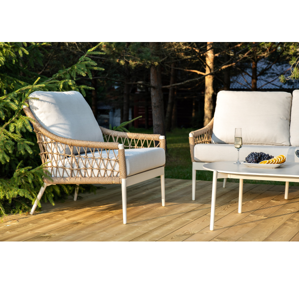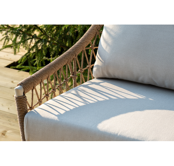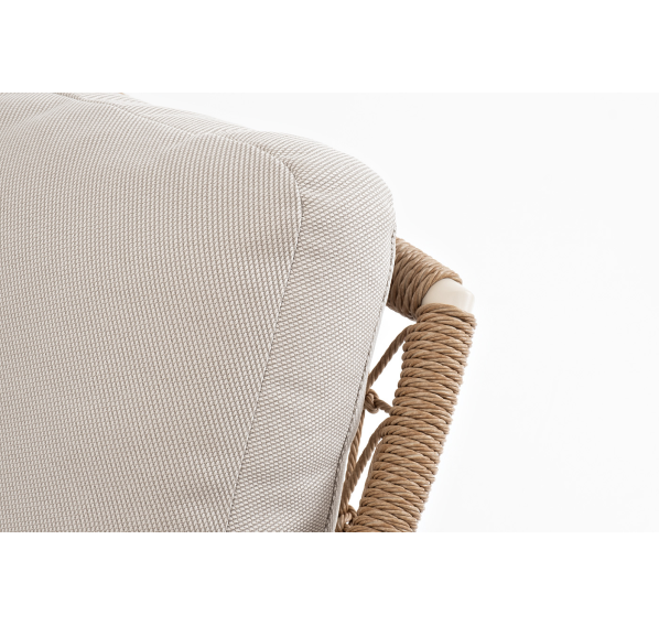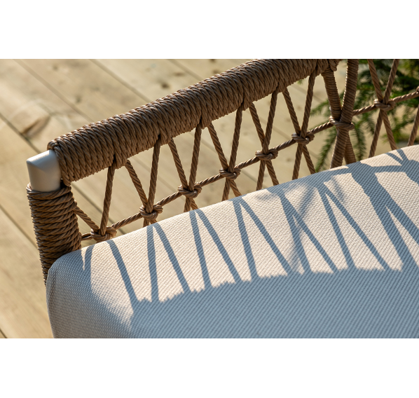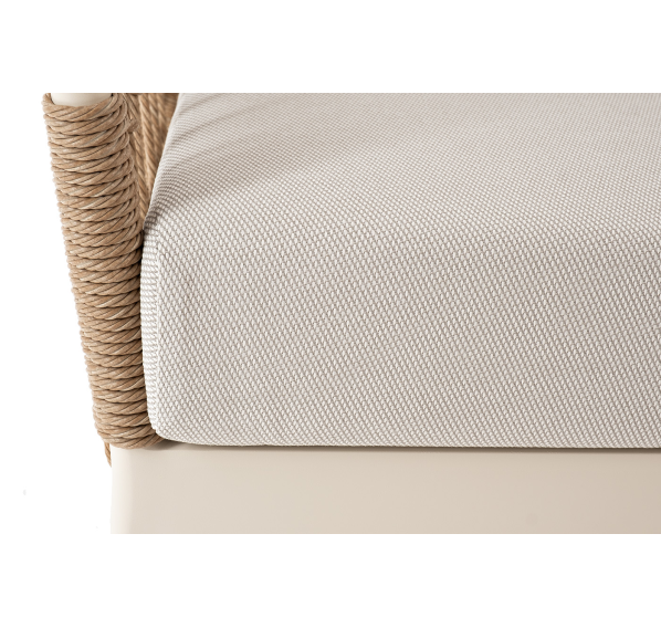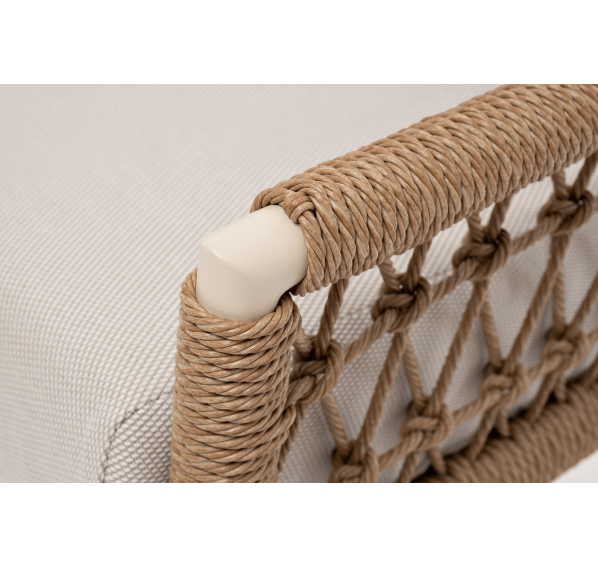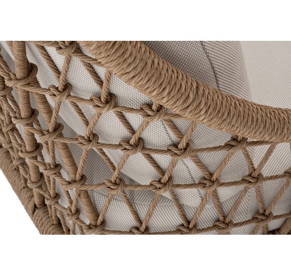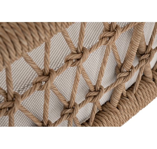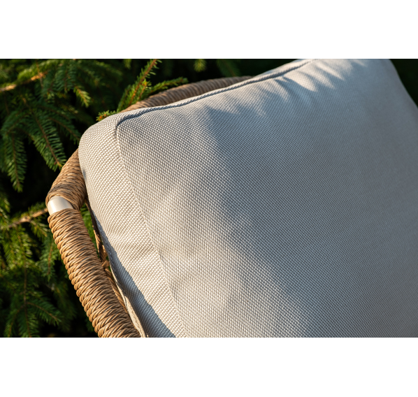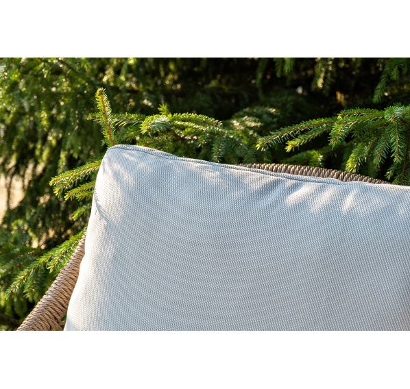 Плетеная мебель дополнена удобными подушками в бежевых чехлах. При их изготовлении используют полиэстер, плотность – 300гр/м2. Он обрабатывается влагоотталкивающей пропиткой для повышения защитных свойств материала.