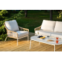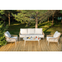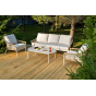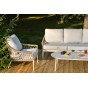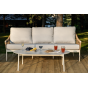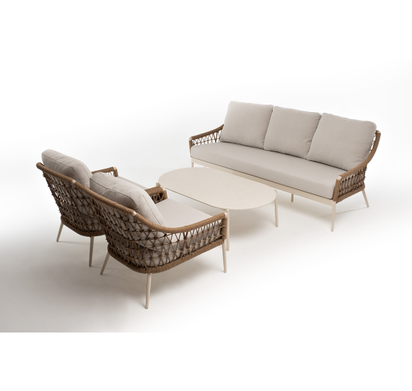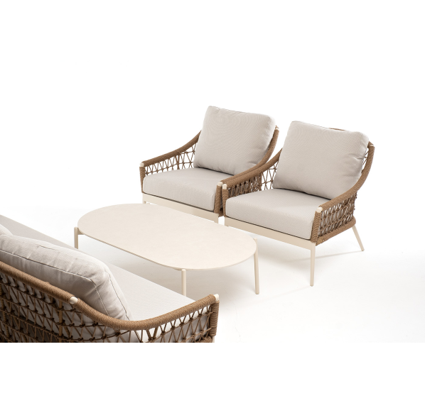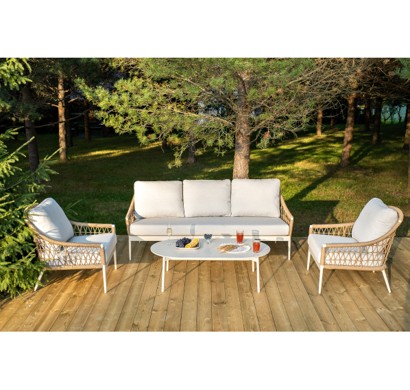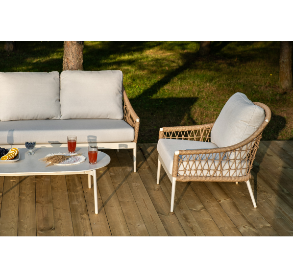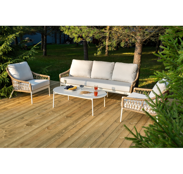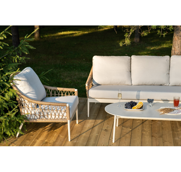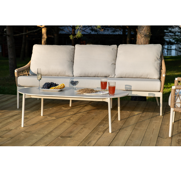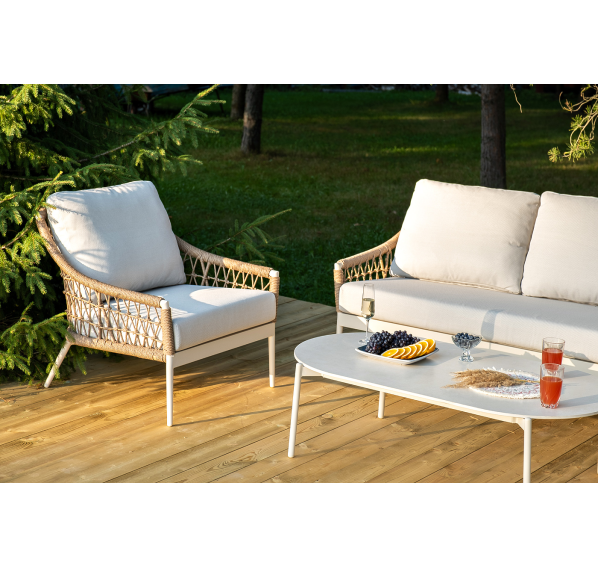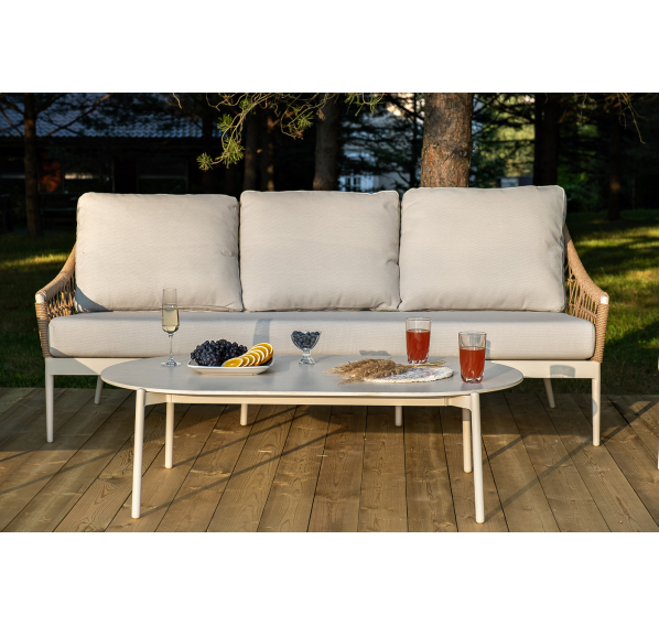 Журнальный столик выполнен из алюминия, окрашенного износостойкой краской, цвет "слоновая кость". Столешница - овальная, выполнена из искусственного камня белового цвета.
