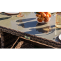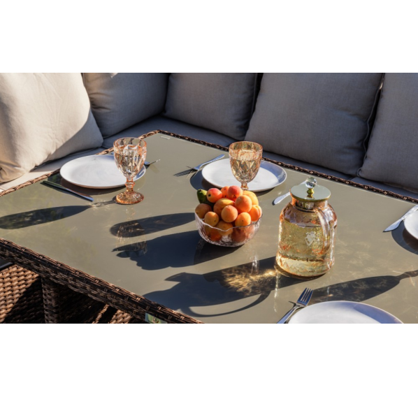 В состав набора входит вместительный угловой диван, а также два пуфа с мягкими подушками-сидениями, которые дополнены высоким обеденным столом со столешницей из закаленного стекла прямоугольной формы. Комплект обеспечивает возможность комфортного размещения компании из 5-7 человек, а размеров стола вполне достаточно для расстановки всех любимых блюд и напитков.