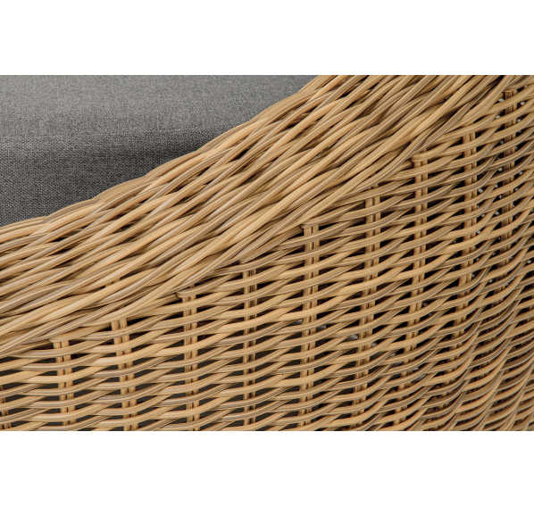 Надежность и износостойкость мебели гарантирует каркас, который сделан из качественного алюминия. Ее дополняет ручное плетение, при изготовлении которого используется искусственный ротанг. Представлена модель в соломенном цвете.