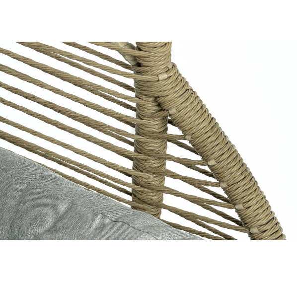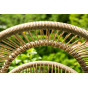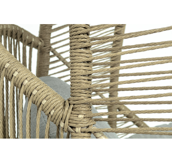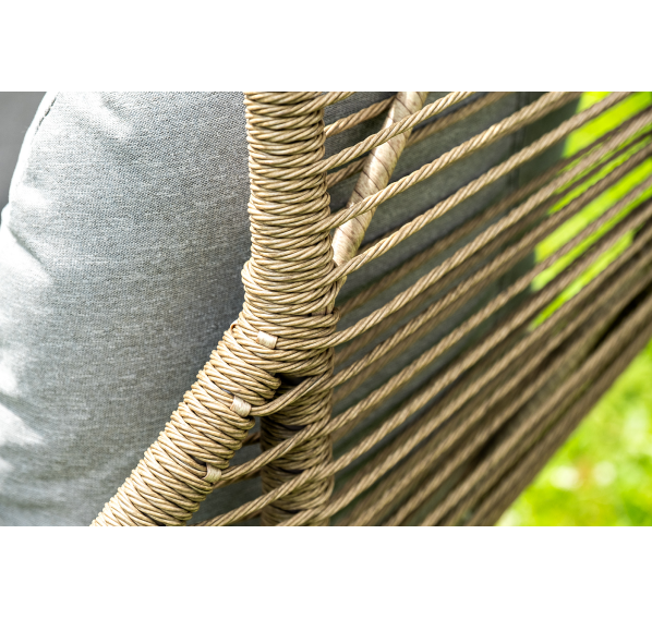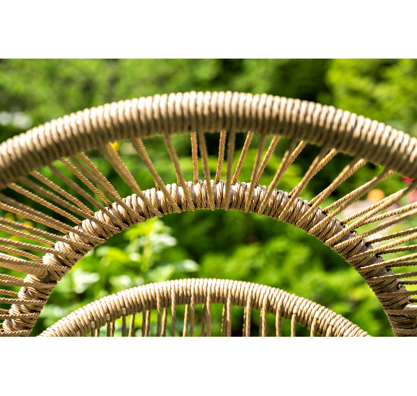 Каркас изготовлен из стали, окрашенного порошковой износостойкой краской бежевого цвета. Оплетка – плоский искусственный ротанг соломенного оттенка. Материал устойчив к перепадам погоды и подходит для использования на открытых пространствах.