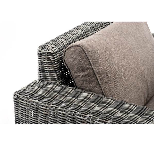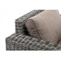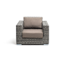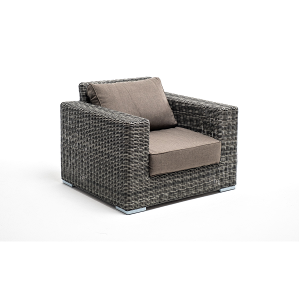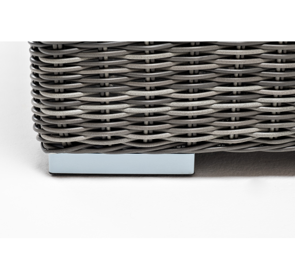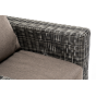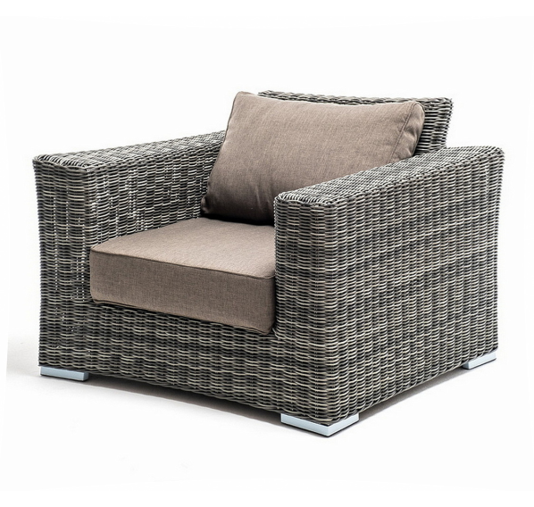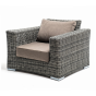 Кресло оснащено каркасом из прочного алюминия, ручное круглое плетение является основным декоративным элементом мебели. Оно выполнено из искусственного ротанга в графитовом цвете.