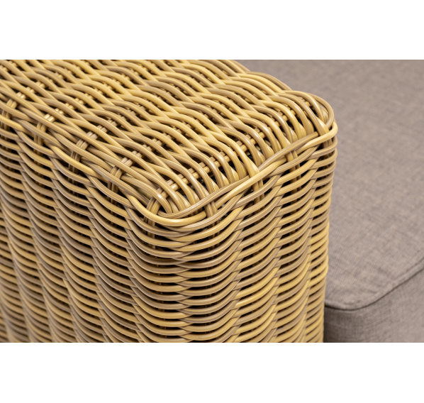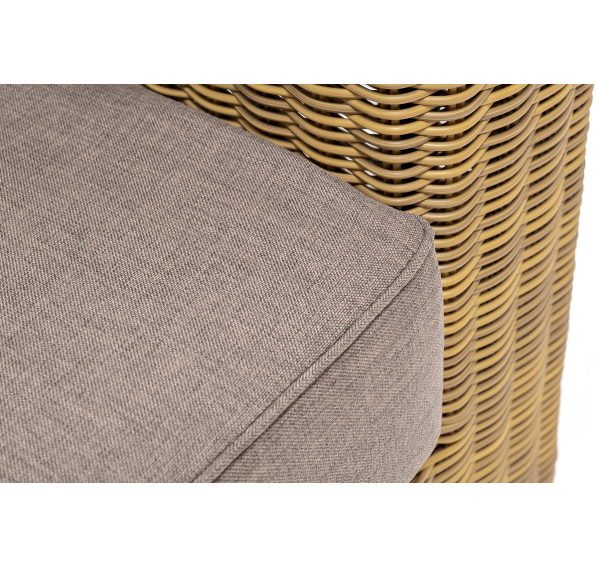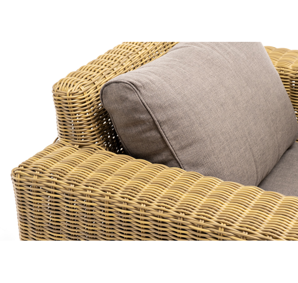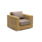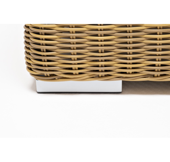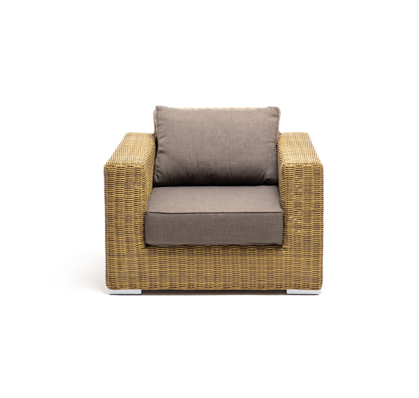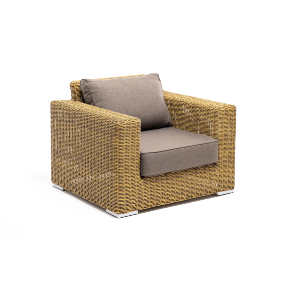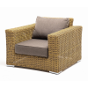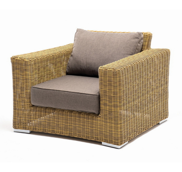 Кресло оснащено каркасом из прочного алюминия, ручное круглое плетение является основным декоративным элементом мебели. Оно выполнено из искусственного ротанга в соломенном цвете.