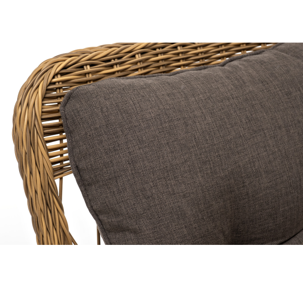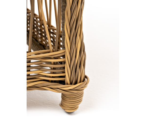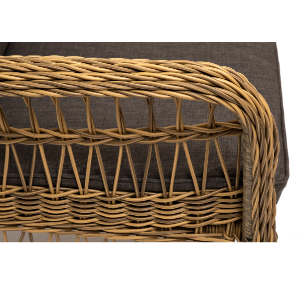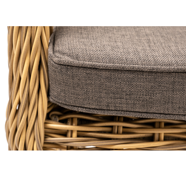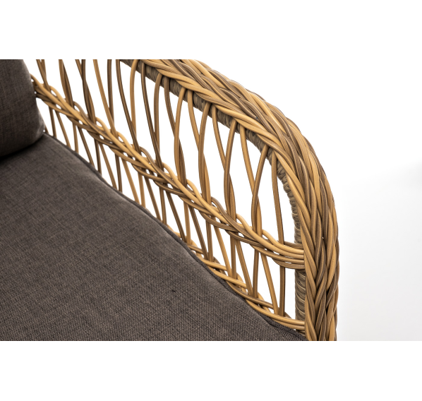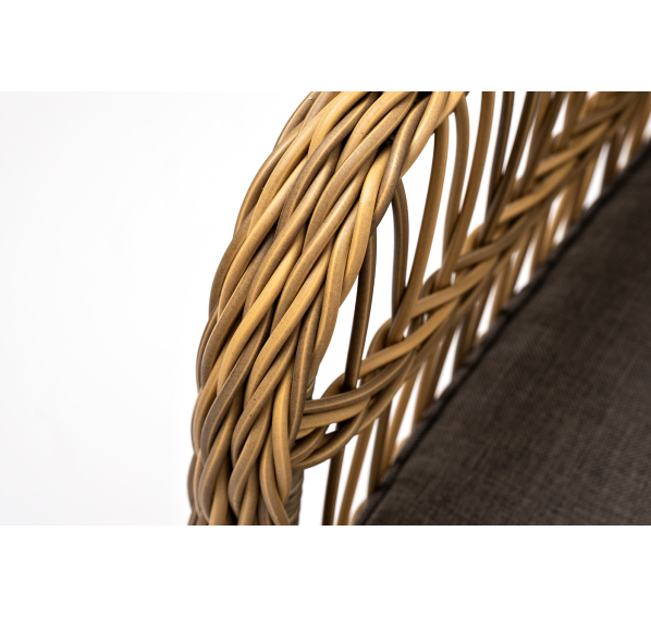 Алюминиевый каркас находится в основе мебели. Он характеризуется устойчивостью и высокой прочностью. Задекорирован ручной круглой оплеткой, которая сделана из искусственного ротанга. Представлена в соломенном оттенке.