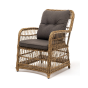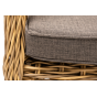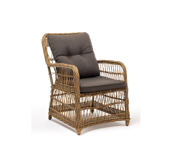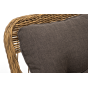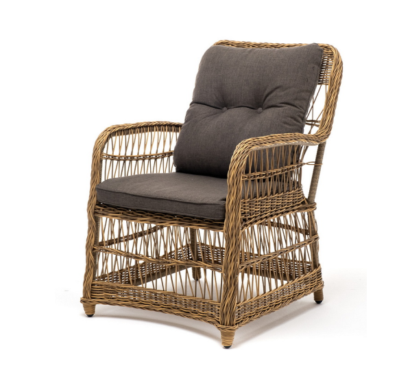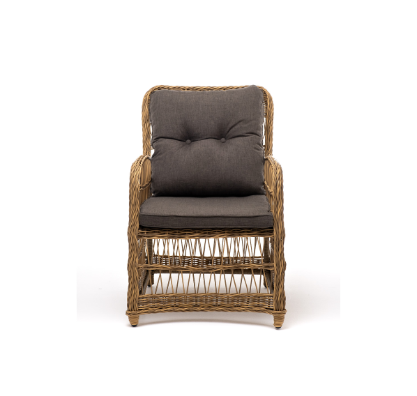 Садовое кресло располагает двумя мягкими подушками, которые идут в комплекте. Они выполнены в сером цвете. Полиэстер высокого качества используется при пошиве тканевых изделий. Его плотность 300гр/м2. Ткань обрабатывается влагоотталкивающей пропиткой.