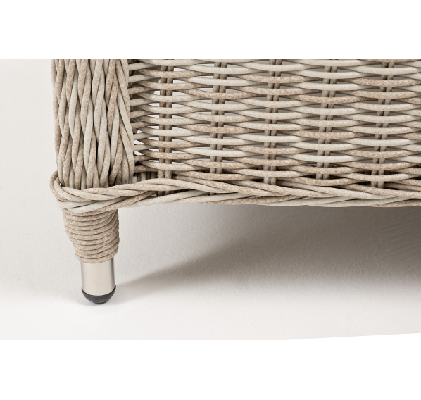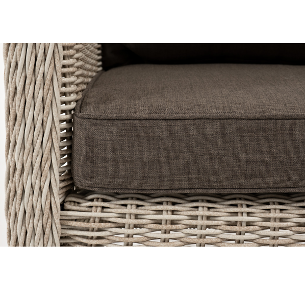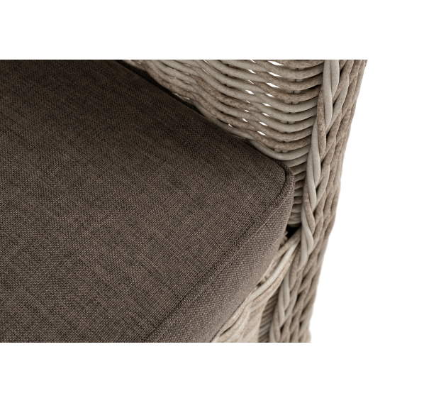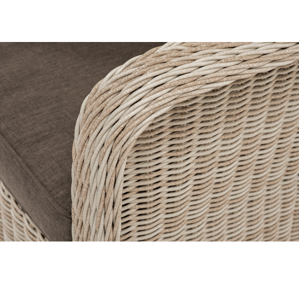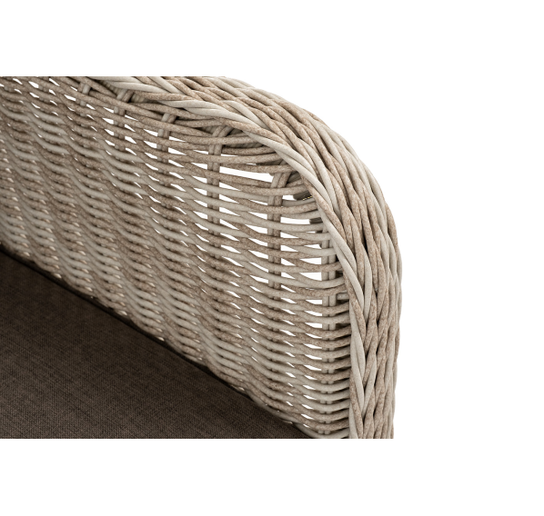 Кресло оснащено каркасом из прочного алюминия, а его оплетка выполнена из круглого ротанга ручного плетения бежевом цвета.