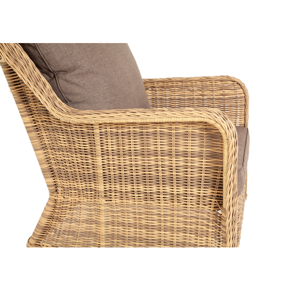 Садовое кресло укомплектовано удобными серыми подушками. Полиэстер используется при пошиве тканевых изделий, плотность которого - 300гр/м2. Материал имеет обязательную влагоотталкивающую пропитку для усиления его защитных свойств.