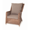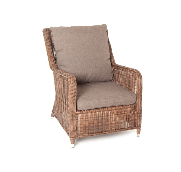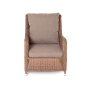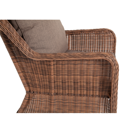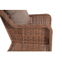 Кресло оснащено каркасом из прочного алюминия, а его оплетка выполнена из круглого искусственного ротанга ручного плетения коричневого цвета.