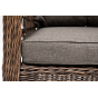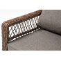 Укомплектовано плетеное кресло удобными мягкими подушками, одна из которых располагается в области спинки. Они выполнены в сером оттенке. При пошиве тканевых изделий используется полиэстер, плотностью 300гр/м2. Он в обязательном порядке проходит обработку влагоотталкивающей пропиткой.