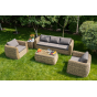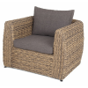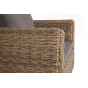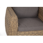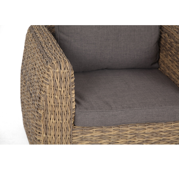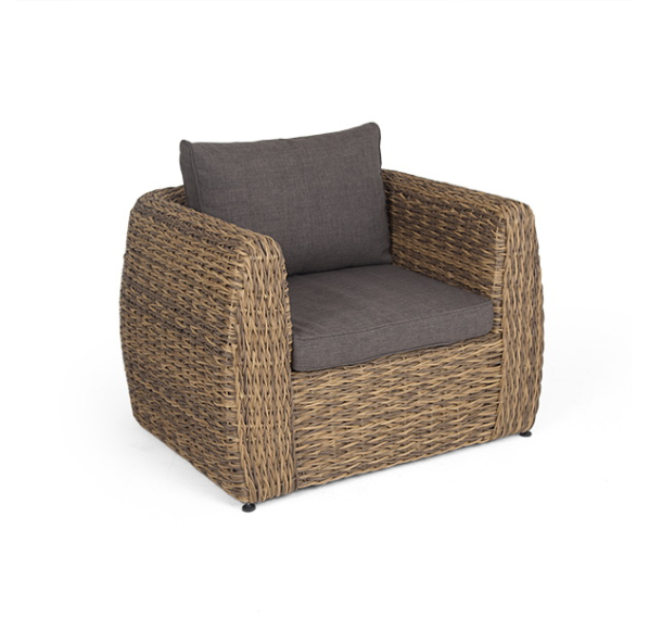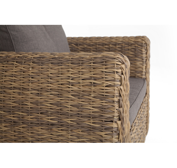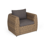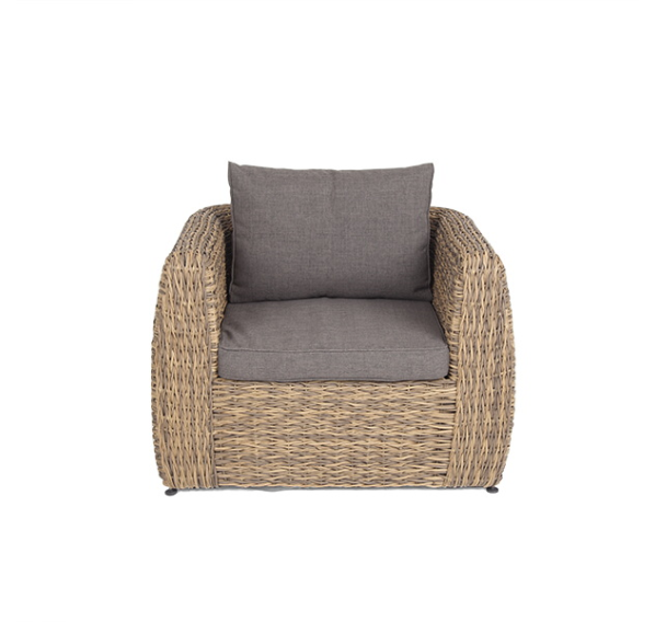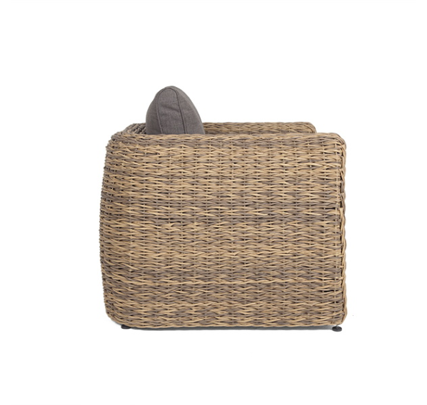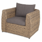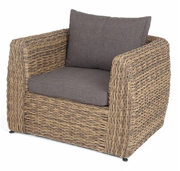 Кресло из искусственного ротанга «Кальяри» оснащено каркасом из прочного алюминия, ручное круглое плетение является основным декоративным элементом мебели. Оно выполнено из искусственного ротанга вида «гиацинт» соломенного цвета.