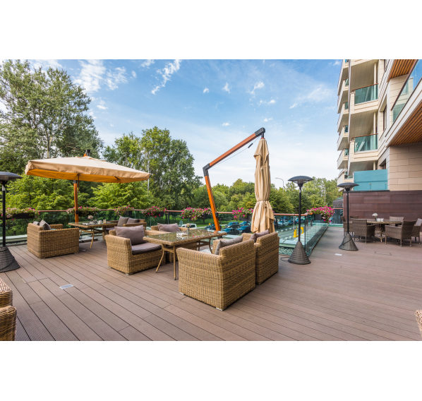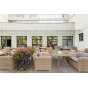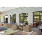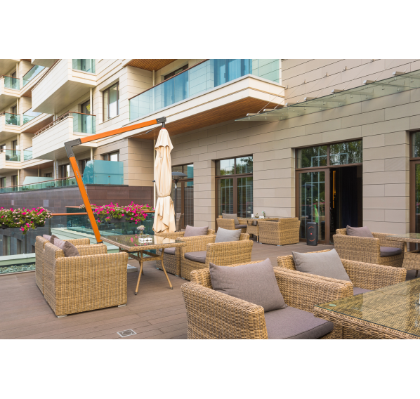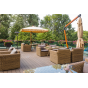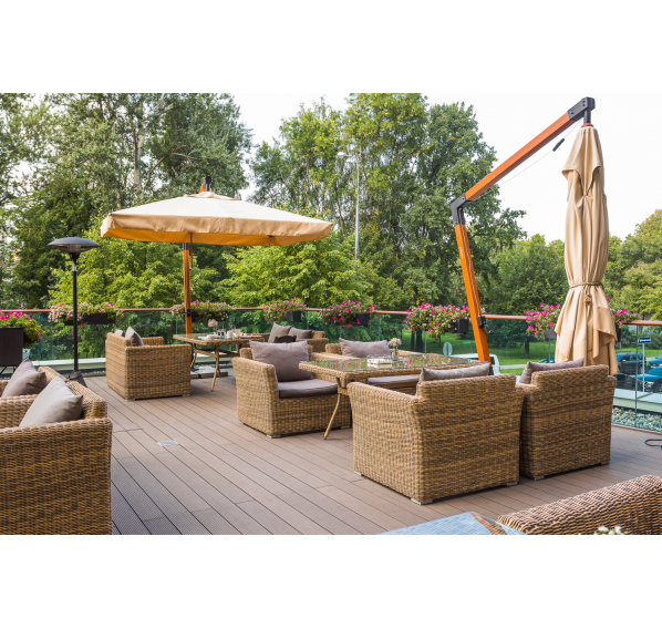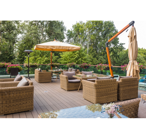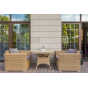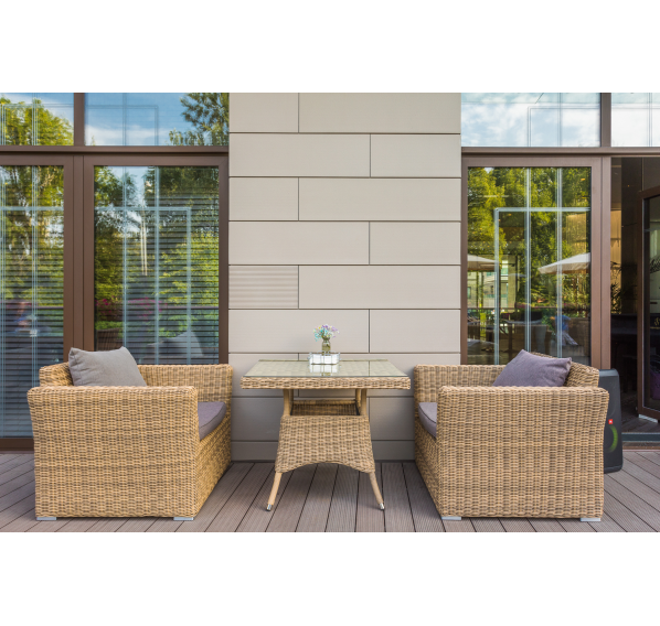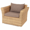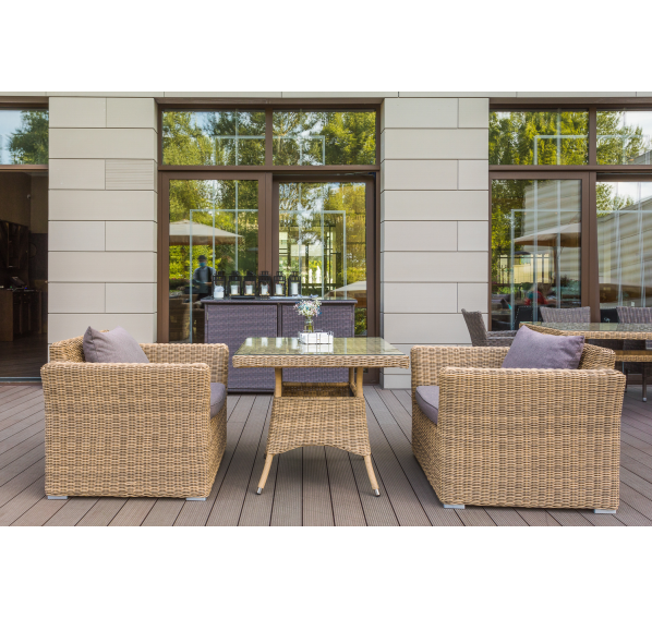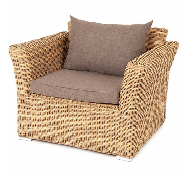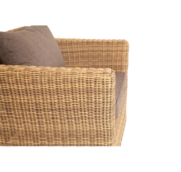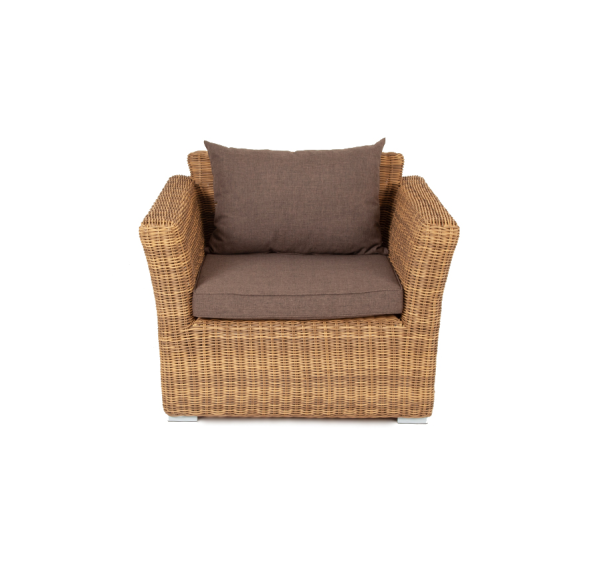Ее отличает алюминиевый каркас высокой прочности. В качестве декоративной составляющей выступает ручное плетение на основе круглого искусственного ротанга. Оно выполнено в соломенном оттенке.