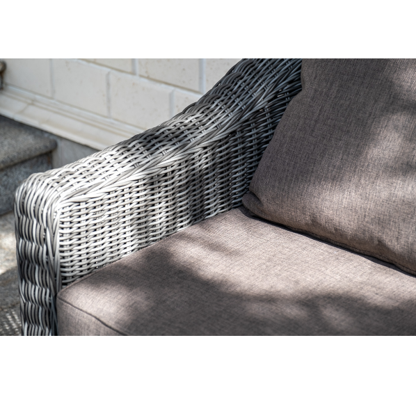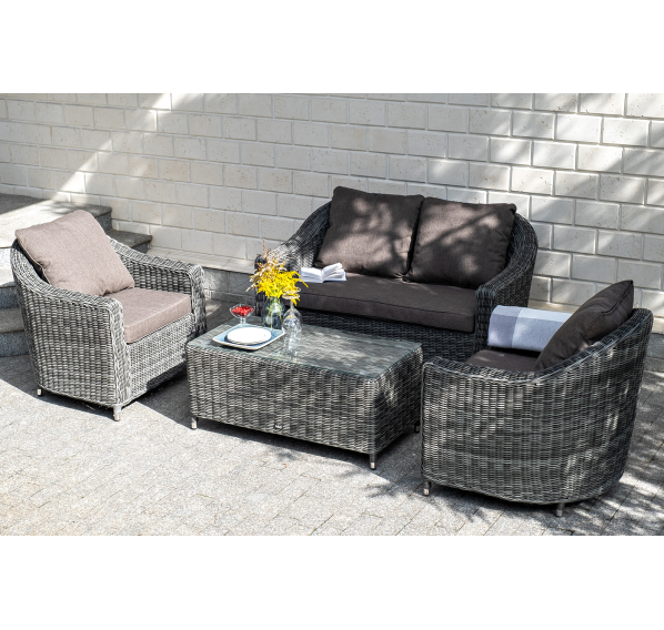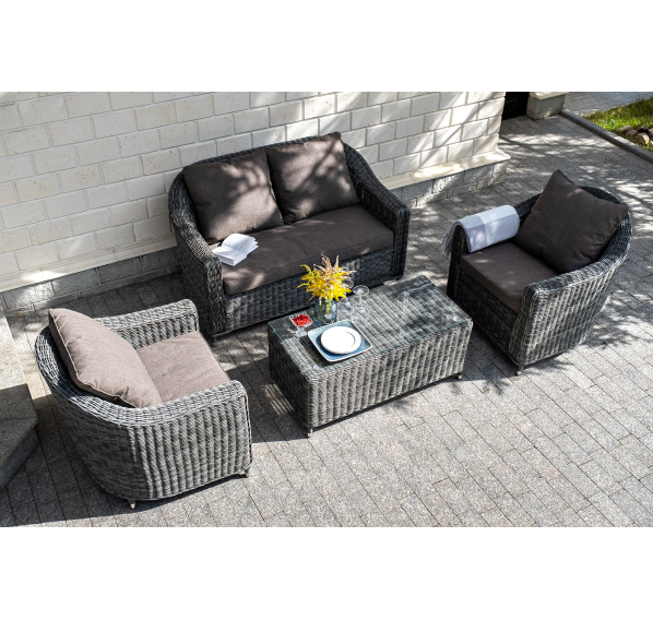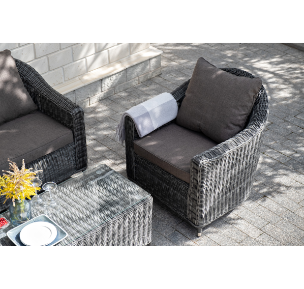 Размер модели – 800×800×800 мм. В качестве основы служит алюминиевый каркас, который оплетен круглым искусственным ротангом графитового оттенка.