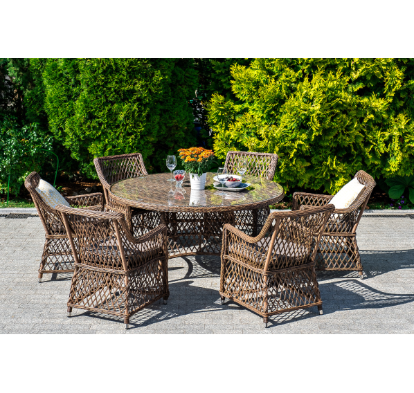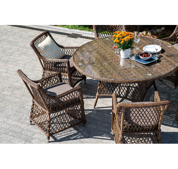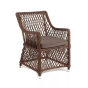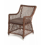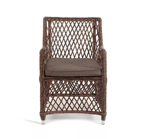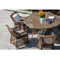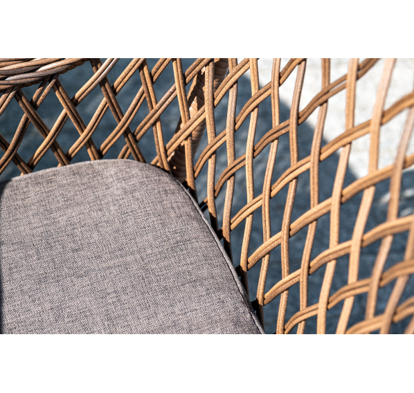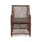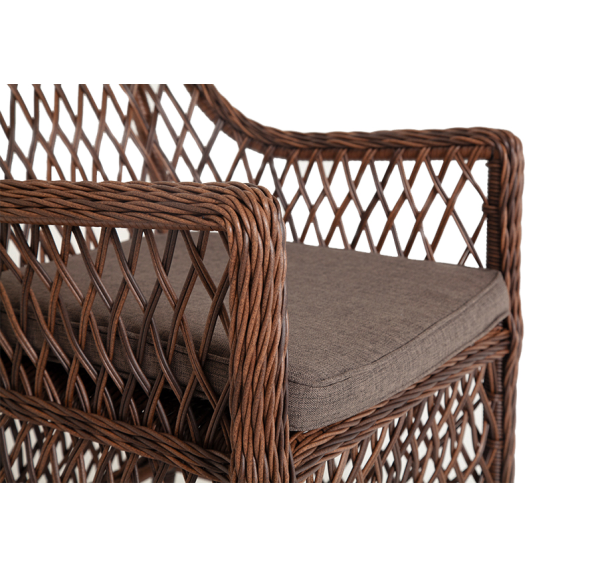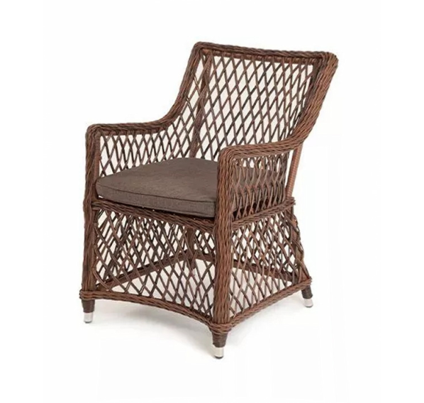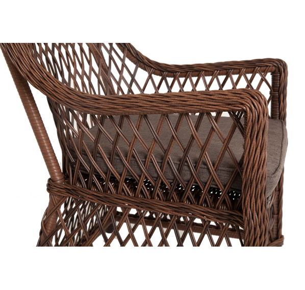 Каркас сделан из прочного алюминия. Сверху конструкции - ручное плетение из круглого искусственного ротанга. Стул коричневого цвета.