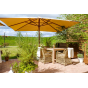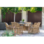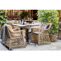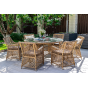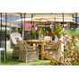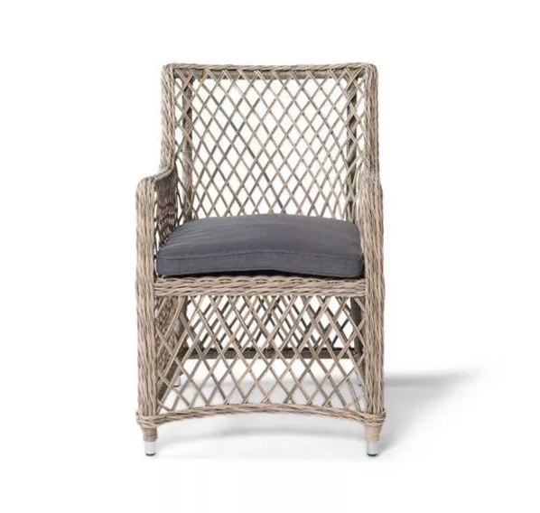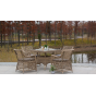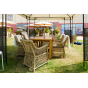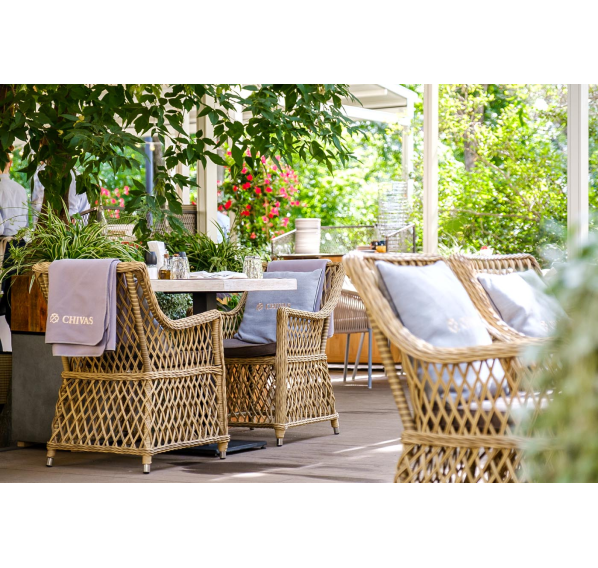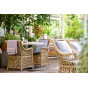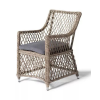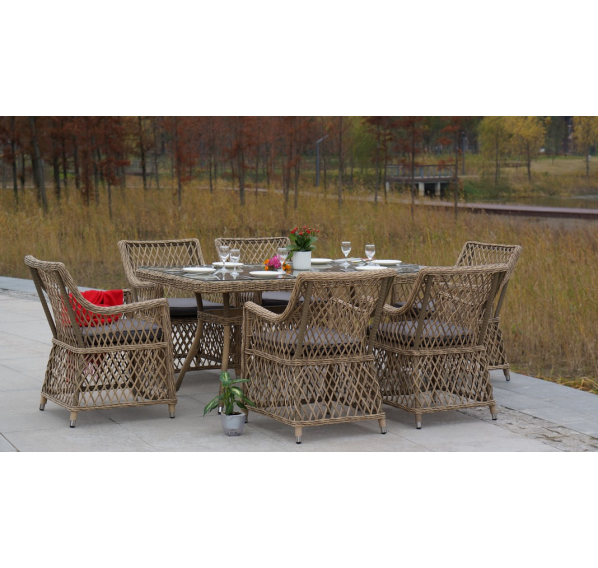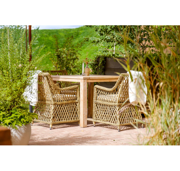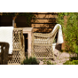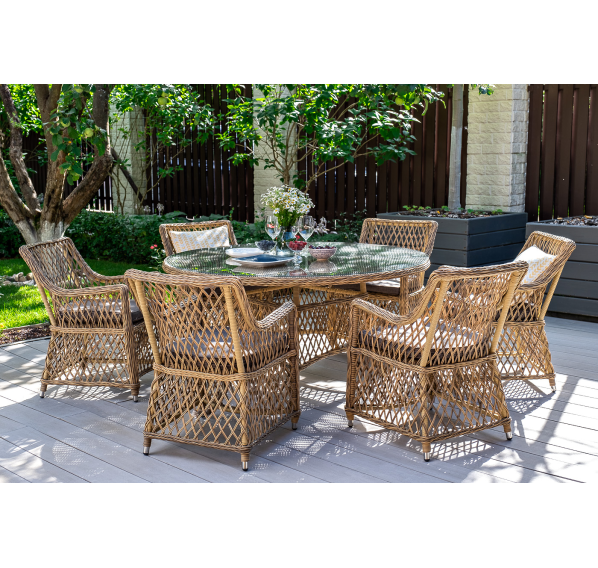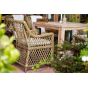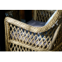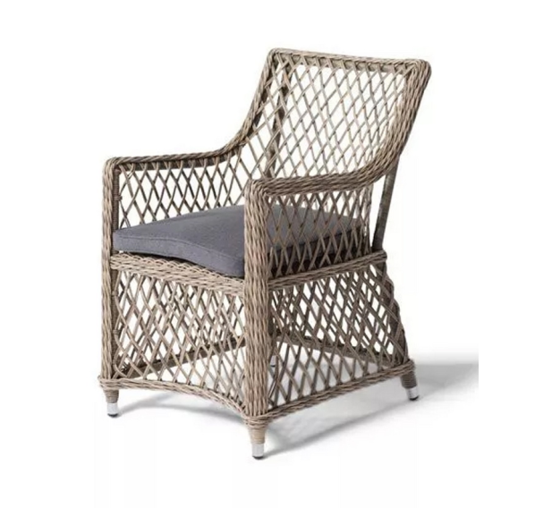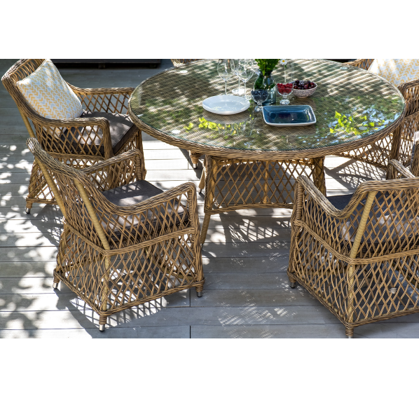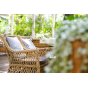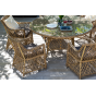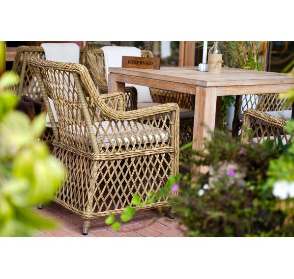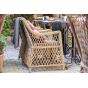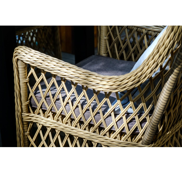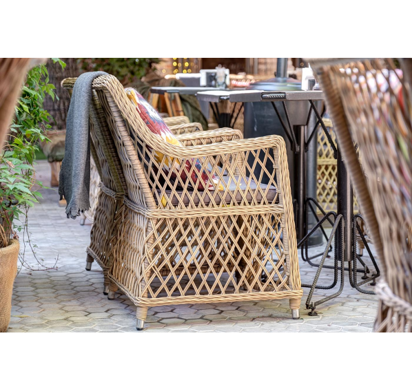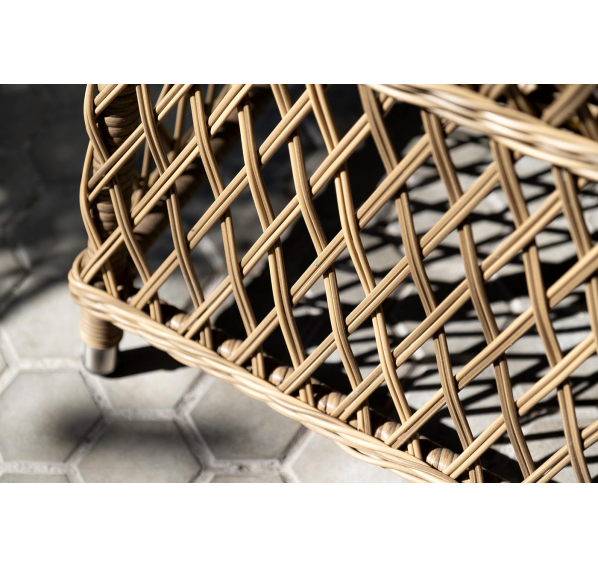 Каркас кресла выполнен из прочного алюминия, который обеспечивает его надежность и долговечность. Внешний вид кресла украшает ручное плетение из круглого искусственного ротанга, создающего приятную и гармоничную атмосферу. Кресло имеет соломенный цвет, который прекрасно сочетается с любым стилем окружающего пространства.