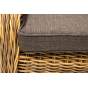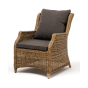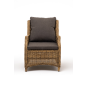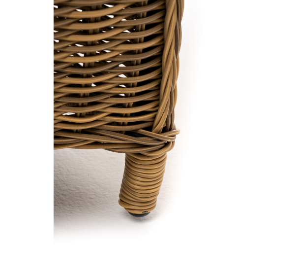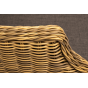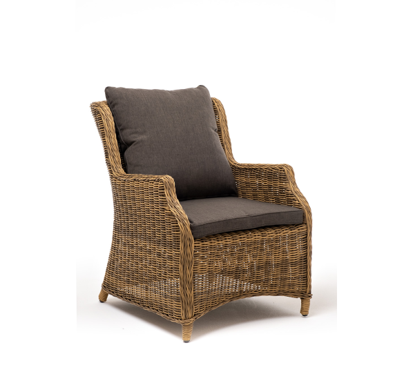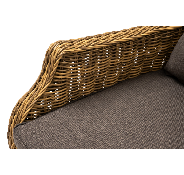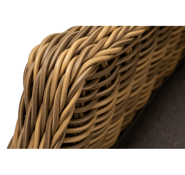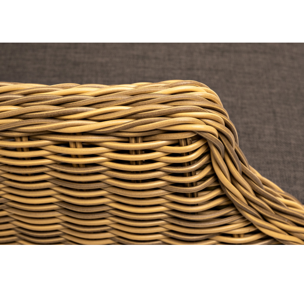 Спинка и подлокотники имеют планые линии, благодаря своим закругленным формам. Каркас мебели сделан из алюминия. Присутствует ручное круглое плетение, при изготовлении которого используется искусственный ротанг. Представлено в соломенном цвете.