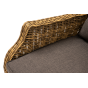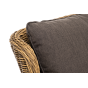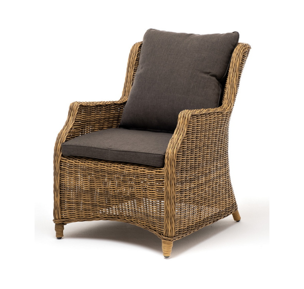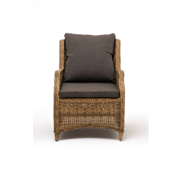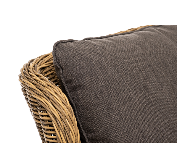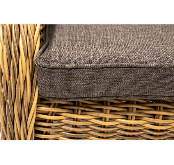 Плетенный стул дополняют мягкие подушки. Они выполнены в сером оттенке. Пошиты изделия из плотного полиэстера 300гр/м2. Ткань предварительно обрабатывается влагоотталкивающей пропиткой.