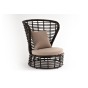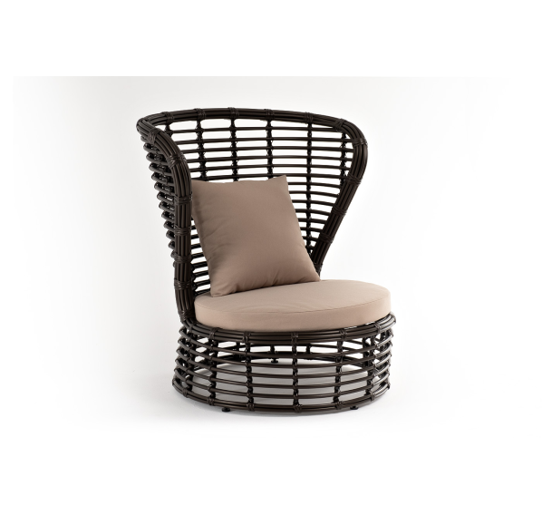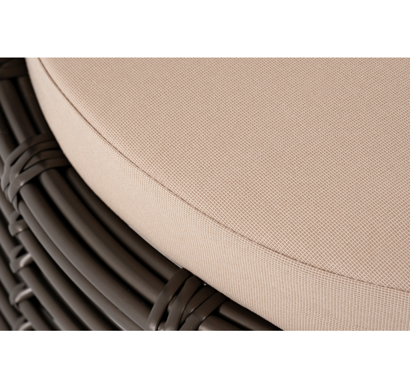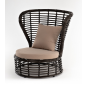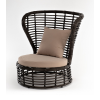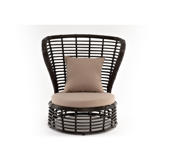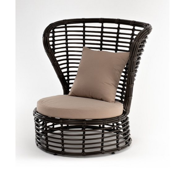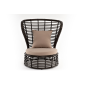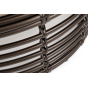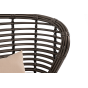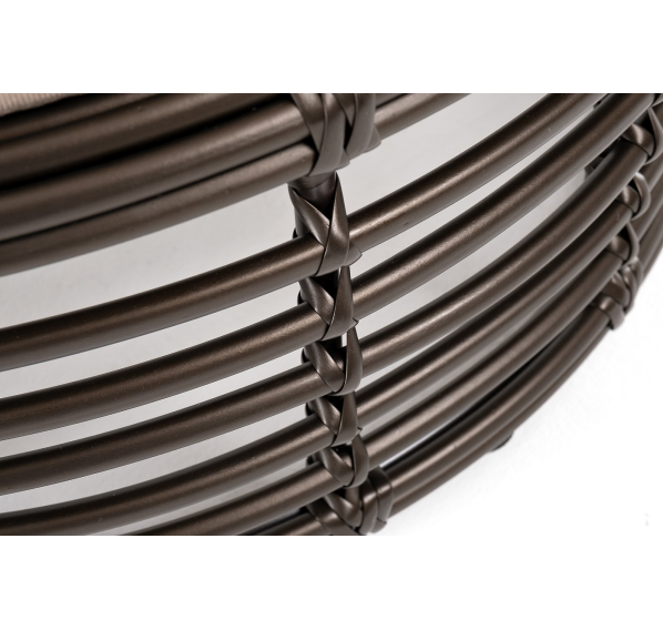 Кресло оснащено каркасом из прочного алюминия, ручное круглое плетение является основным декоративным элементом мебели. Оно выполнено из искусственного ротанга в бронзовом цвете.