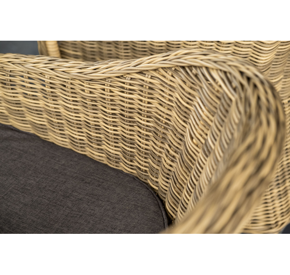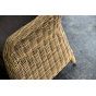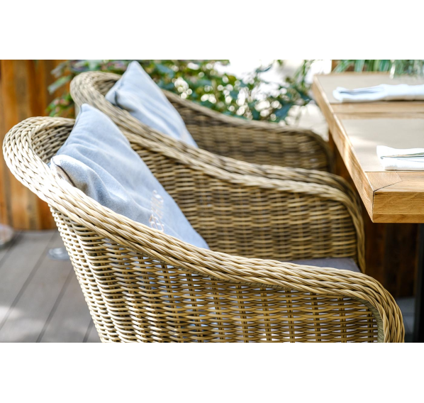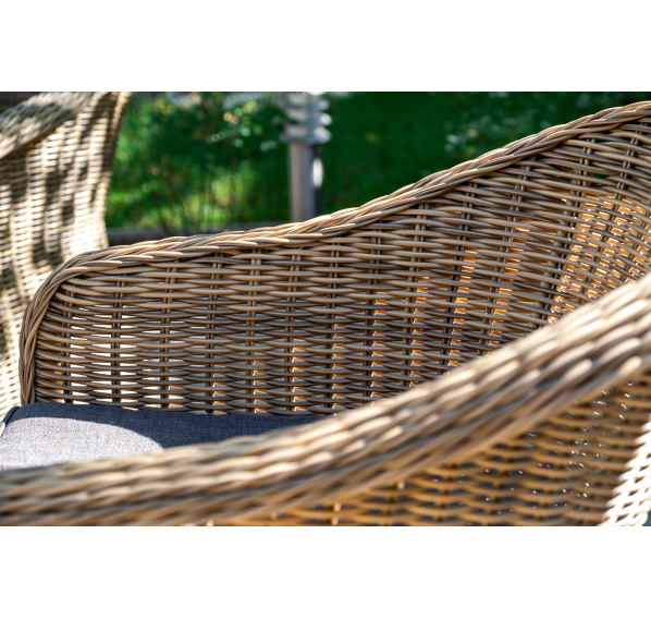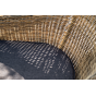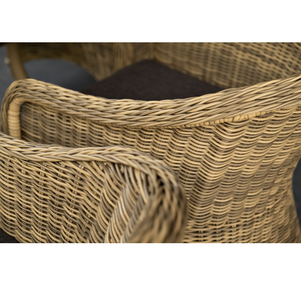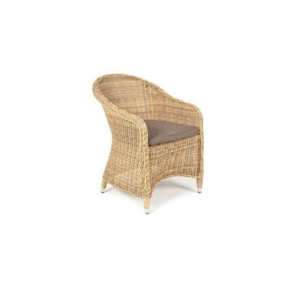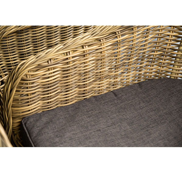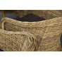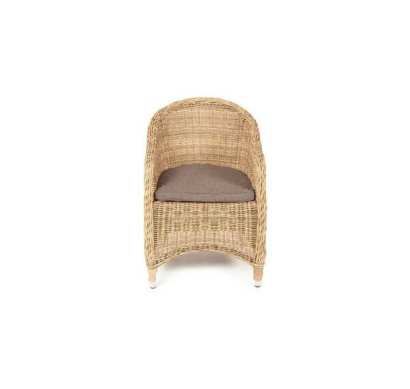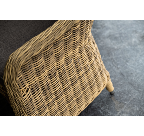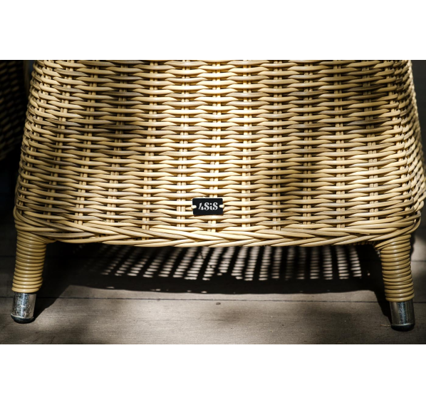Кресло изготовлено с помощью ручного плетения и выполнено из круглого искусственного ротанга соломенного цвета. Для укрепления конструкции использован алюминиевый каркас. Благодаря ему плетеное кресло остается легким, но прочным.