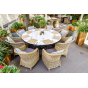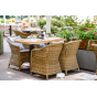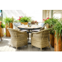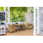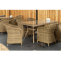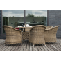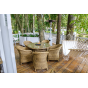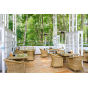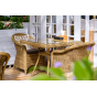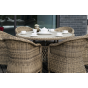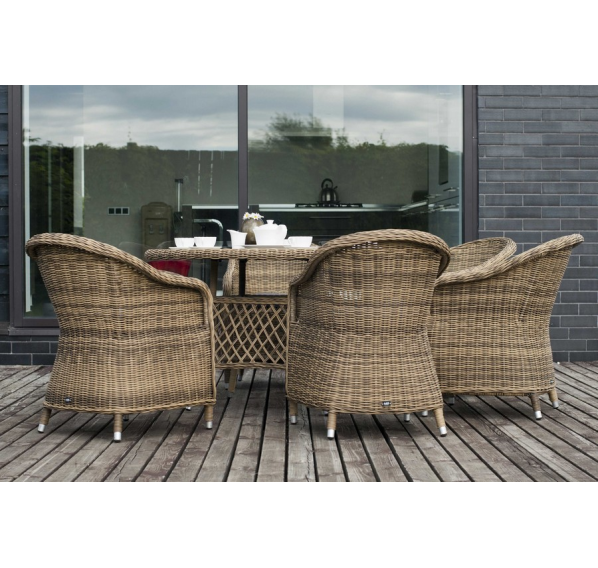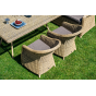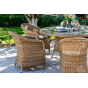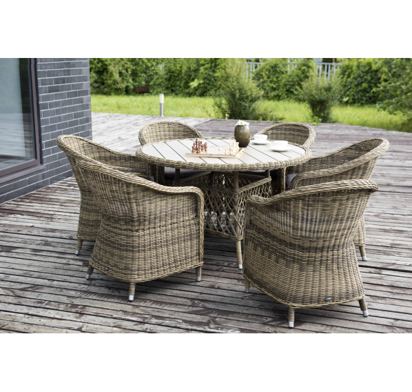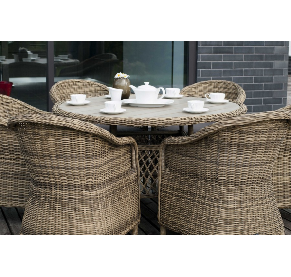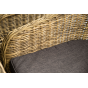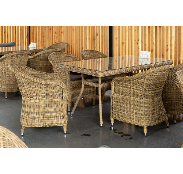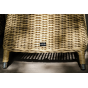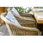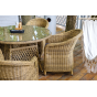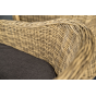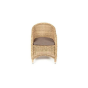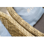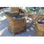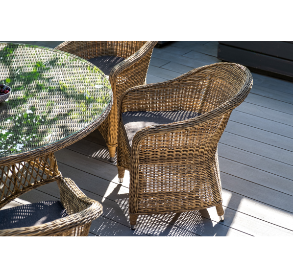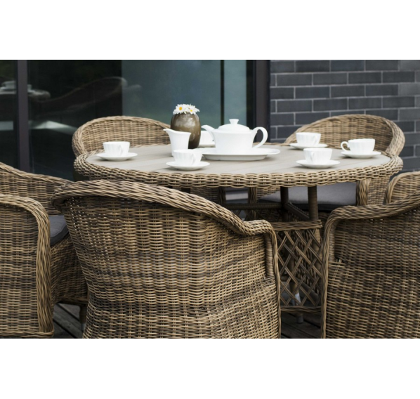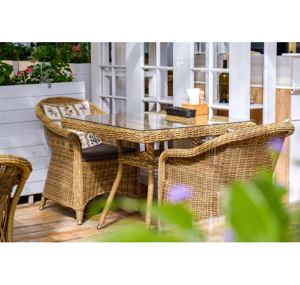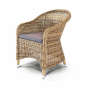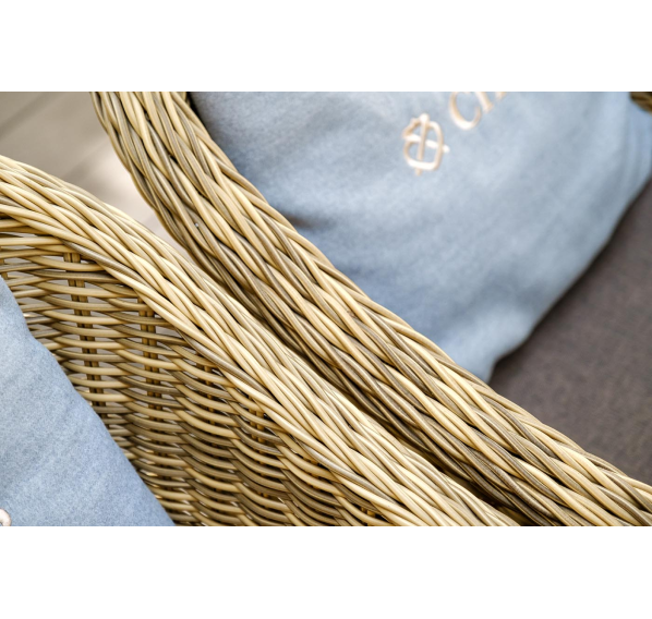 Кресло изготовлено с помощью ручного плетения и выполнено из круглого искусственного ротанга соломенного цвета. Для укрепления конструкции использован алюминиевый каркас. Благодаря ему плетеное кресло остается легким, но прочным.
