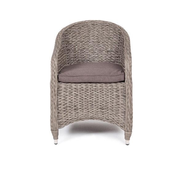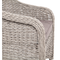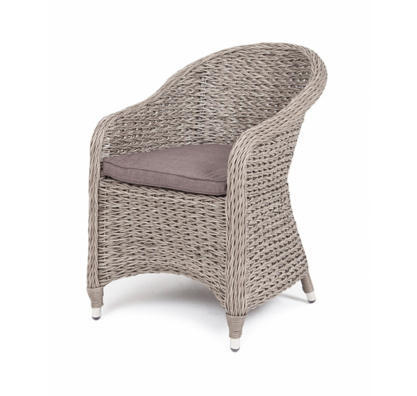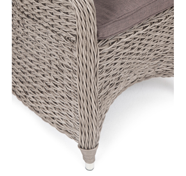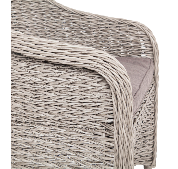 Кресло из искусственного ротанга «Равенна» с плетением вида «гиацинт» обладает крепким алюминиевым каркасом, который вручную обвит ротангом серого оттенка.