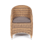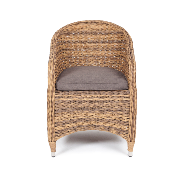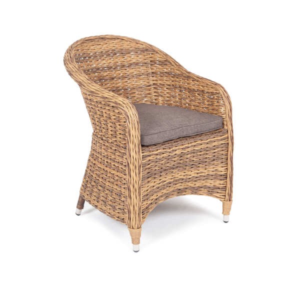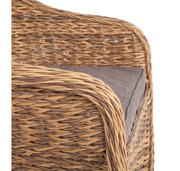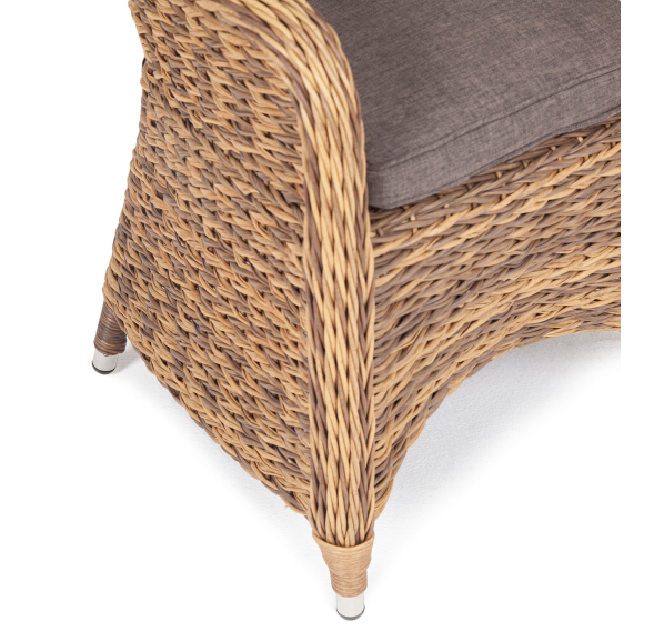 Кресло изготовлено посредством ручного плетения соломенного цвета. Для укрепления конструкции использован алюминиевый каркас. Благодаря ему плетеное кресло остается легким, но прочным.