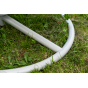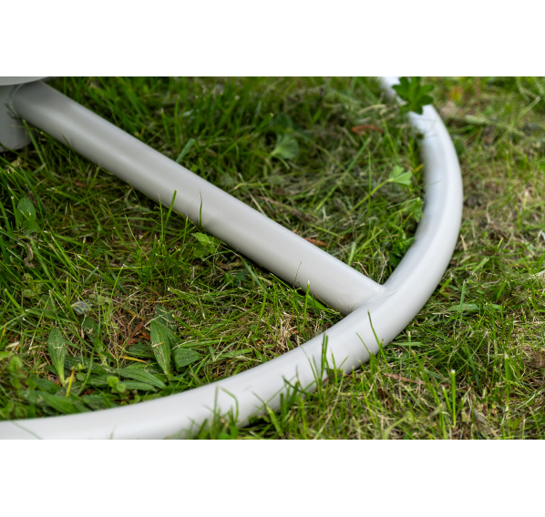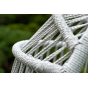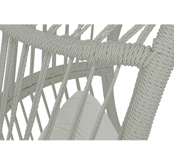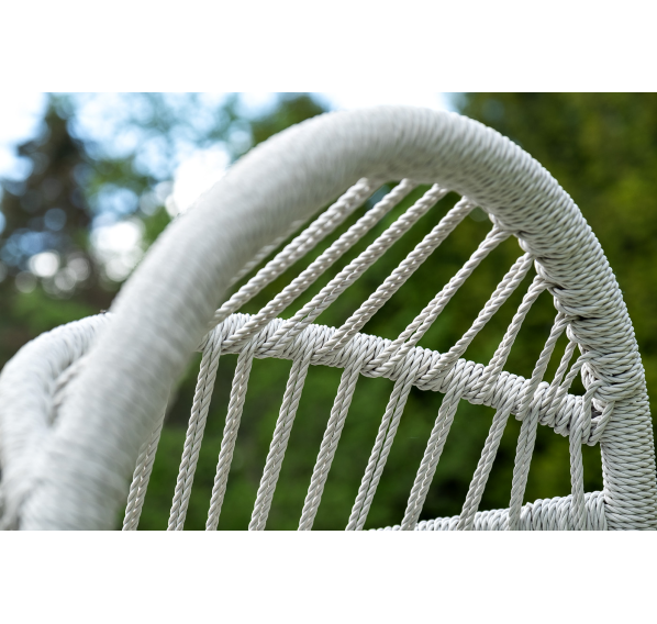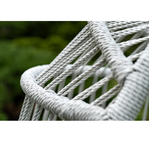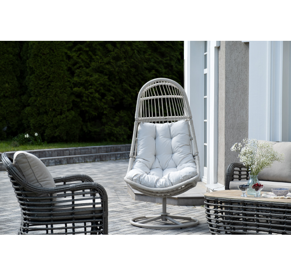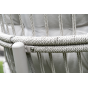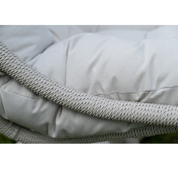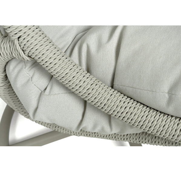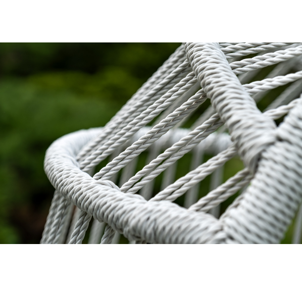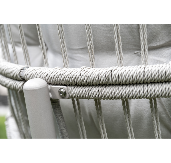 Каркас изготовлен из стали, окрашенного порошковой износостойкой краской белого цвета. Оплетка – плоский искусственный ротанг светло-серого оттенка. Материал устойчив к перепадам погоды и подходит для использования на открытых пространствах.